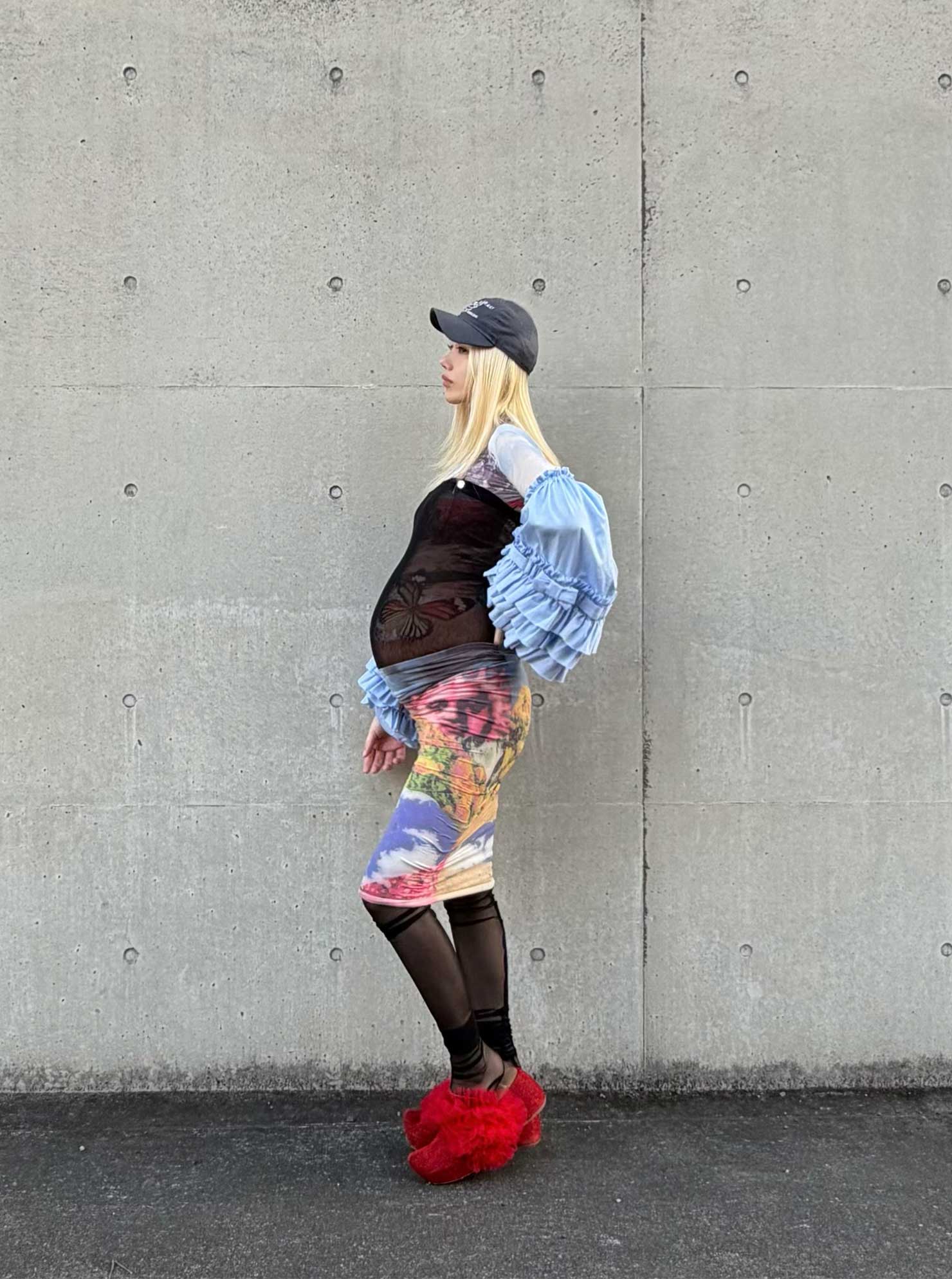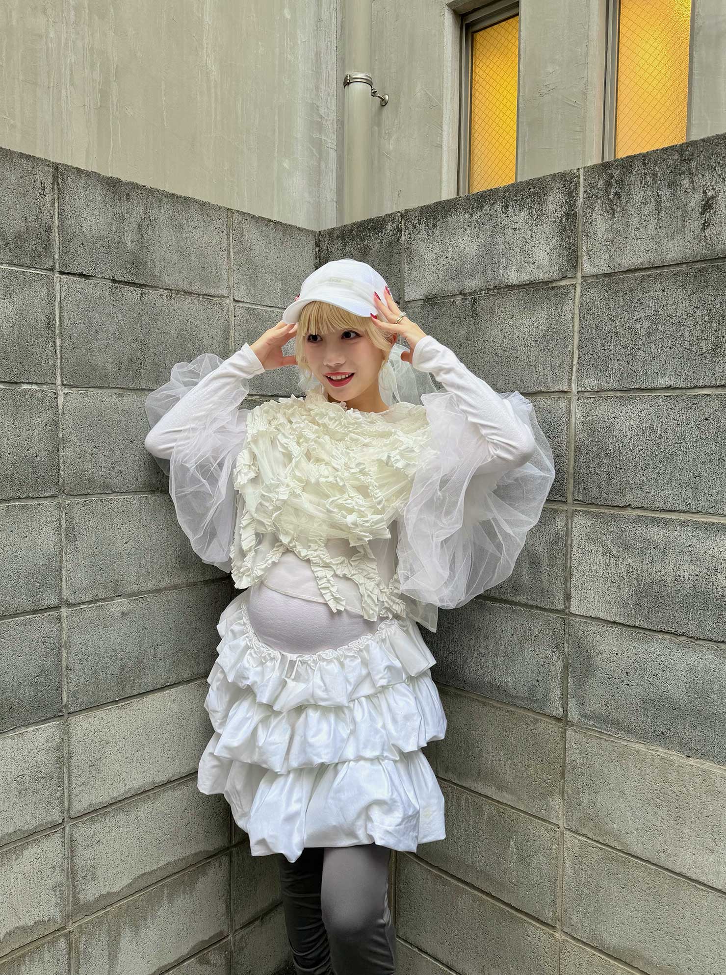 トップス/チカキサダ、インナー/プチバトー 、スカート/ノワール ケイ ニノミヤ、キャップ/キムへキム