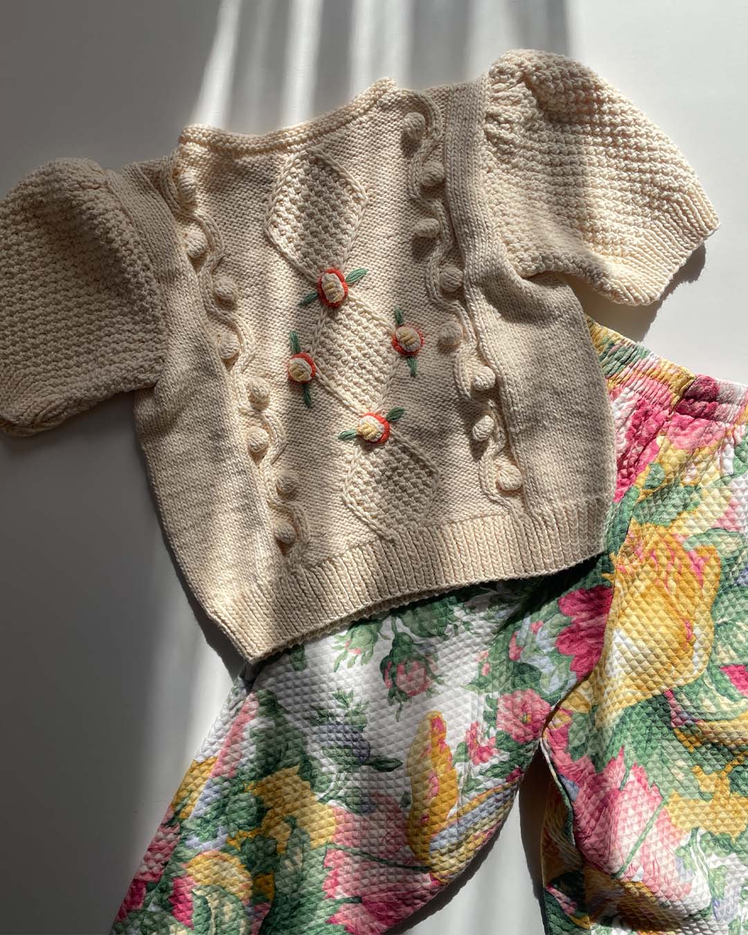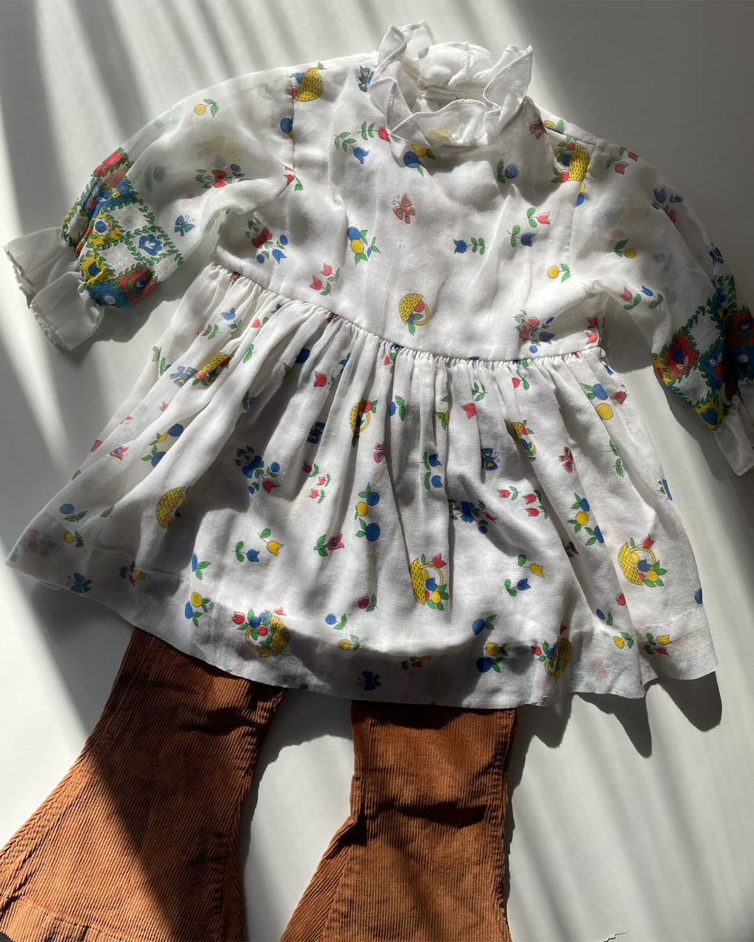 「ヴィンテージのデザインがとっても可愛く、購入しました。生地はガーゼでやわらかく赤ちゃんのお洋服のような素材にときめきました。丈が短くなってもフレアパンツに重ねて着せたいです」
