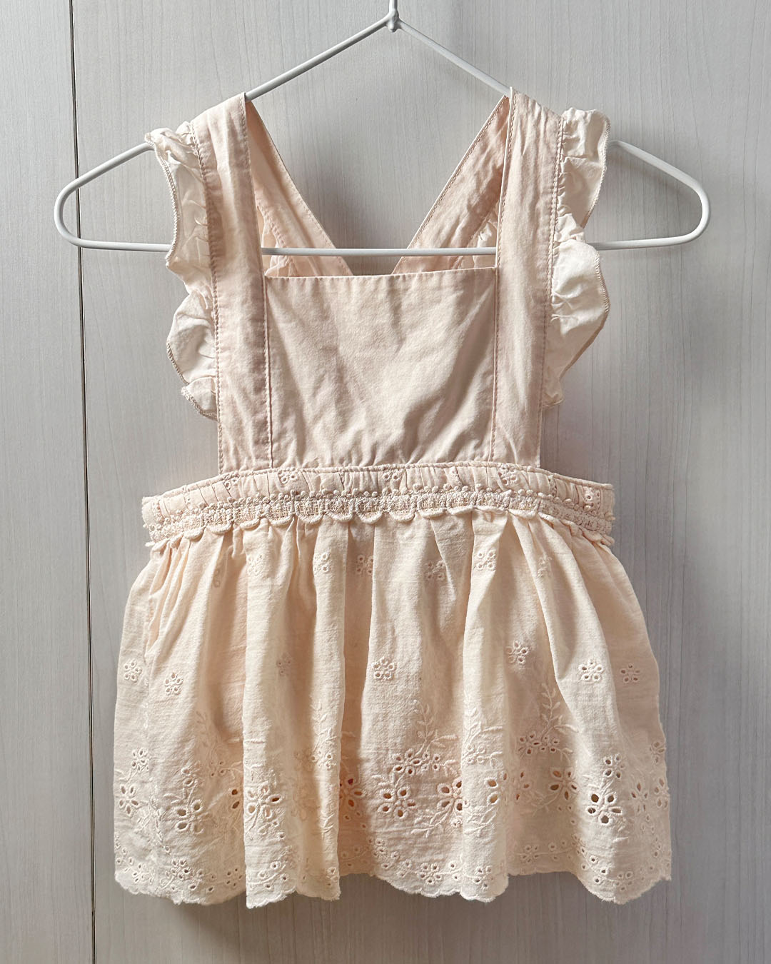 「二段階の長さ調節があるので、寒い時期はニットと重ねて、暖かくなったらブラウスと合わせて楽しめます。娘の成長スピードに合わせてサイズを調整しながら、長く着られるところもお気に入り。淡いピンクなところも惹かれたポイントで、この春に迎える初節句の際にも活躍しそう♪ バレエコアな雰囲気で着させてあげたいなと考えています!」