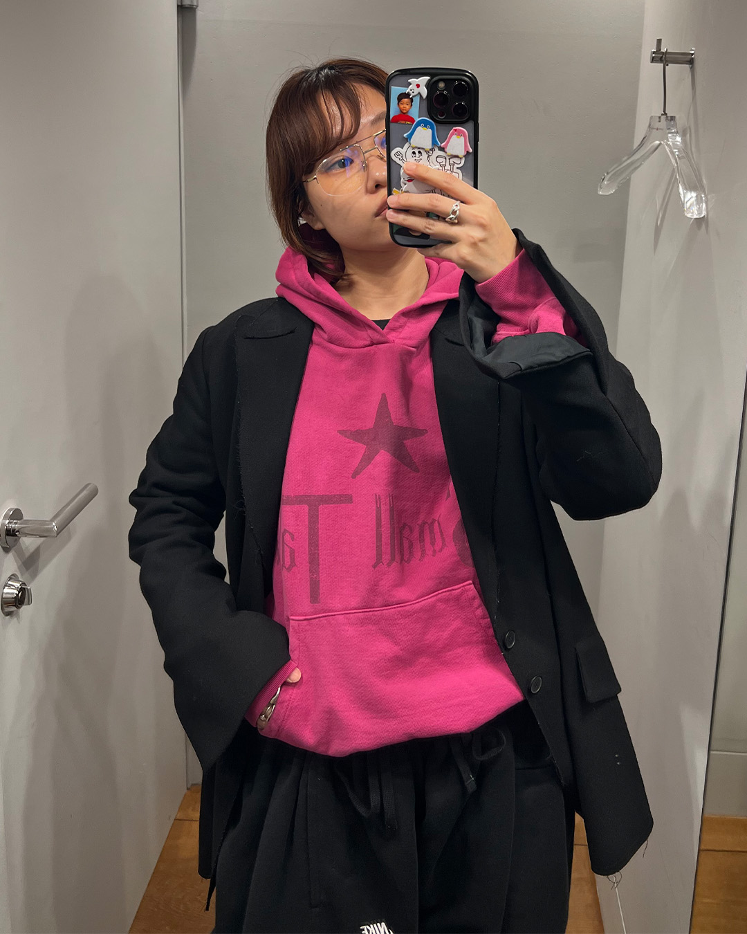 「コンパクトなサイズ感とヴィヴィッドピンクが購入の決め手です! ワイドパンツやスニーカーとシンプルに合わせてもバランスよく決まります。子どもとの休日にも気兼ねなく着れるので、可愛いスウェットを集めがちです」