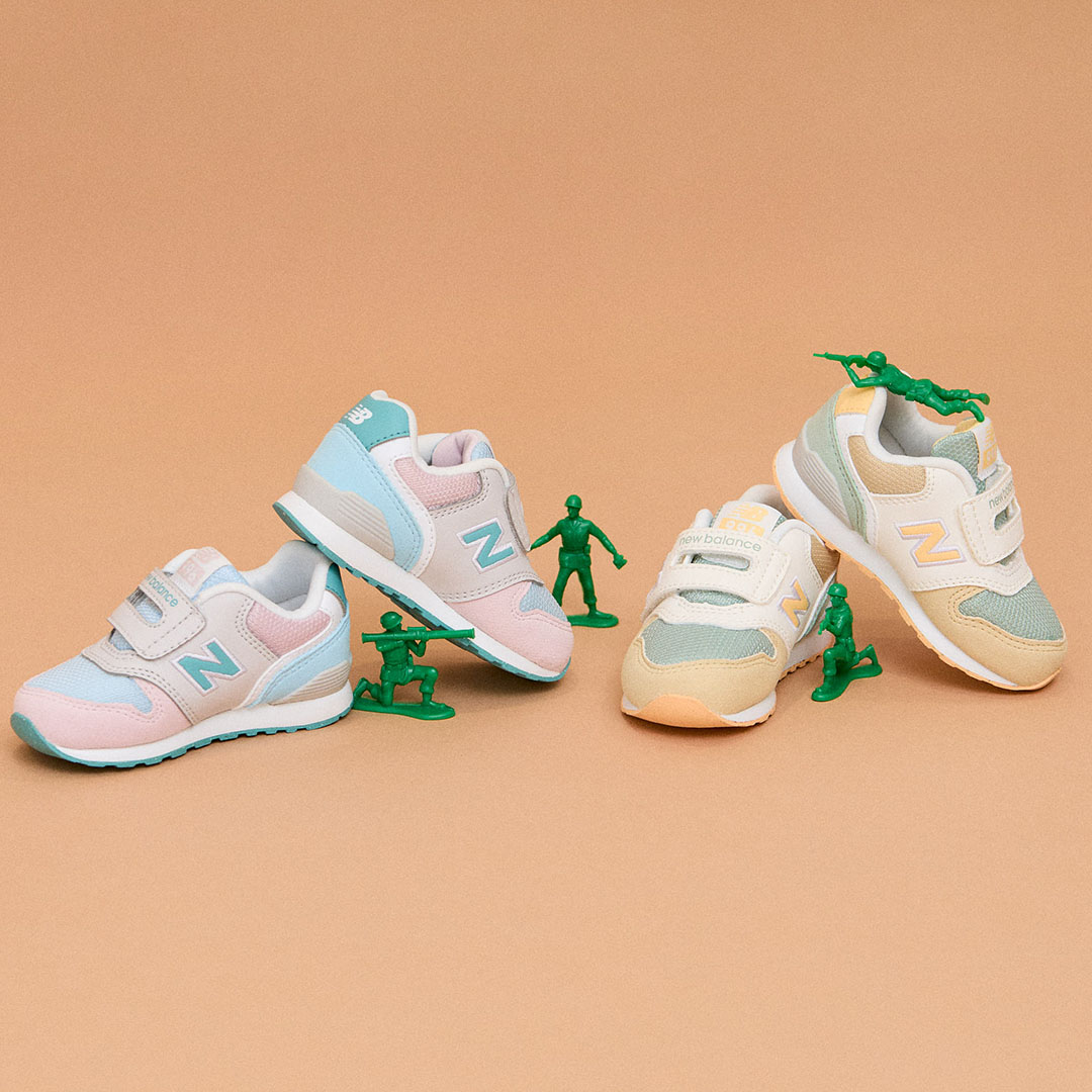 『New Balance』の人気モデル「996 v3」のインファントモデル。思わずキュンとするニュアンスカラーのコンビデザインが春コーデにもぴったりの一足。脱ぎ履きしやすい面ファスナーで、小さな子どもでも履きやすいのがポイント。クッション性と屈曲性抜群の軽量ソールが、元気に走り回る日も快適な履き心地を叶えてくれる。さりげないブランドロゴもアクセント。