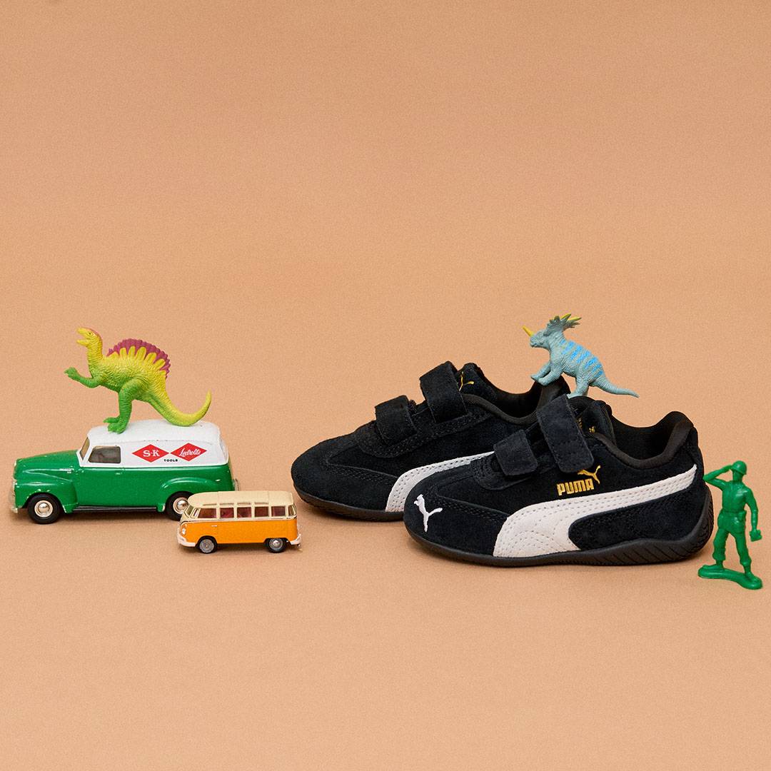 レースカルチャーをルーツに持つ『PUMA』の「スピードキャット OG」のインファントモデル。上質なブラックスエードに、スピード感のあるラインが映えるアイコニックな一足。面ファスナー仕様なので小さい子でも着脱が簡単。インソールには「KinderFit」を採用し、子どもの成長に合わせて足のサイズを確認できるのも嬉しい。履くだけでコーデがぐっと引き締まる、おしゃれキッズにぴったりなスニーカー。