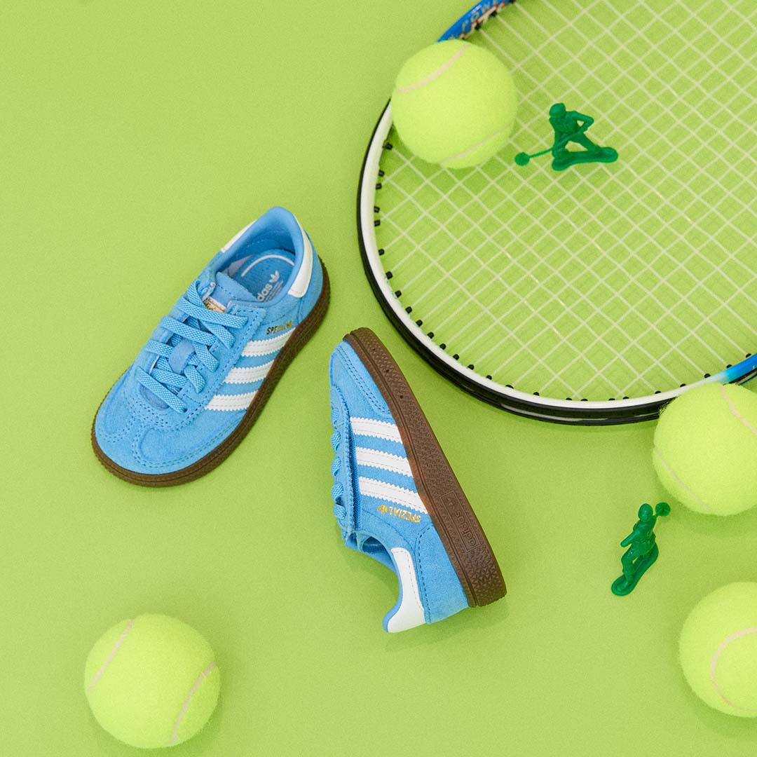 1970年代のクラシックなハンドボールシューズを、キッズ向けにアレンジした『adidas』の人気モデル「ハンドボール スペツィアル」。伸縮性のあるゴム製シューレースと面ファスナー式ストラップを組み合わせた設計で、履き口が大きく開くので、子どもが自分でスニーカーを履く練習をするのにもちょうどいい一足。足にやさしくフィットする履き心地で、鮮やかなブルーがコーデのアクセントに。