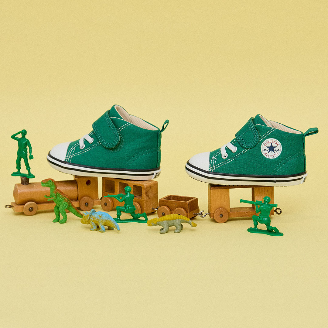コーデのアクセントになる鮮やかなグリーンが印象的な「ベビー オールスター V-1」。ベルトタイプのストラップが脱ぎ履きしやすく、つまみやすい広めのかかとテープが着脱をサポート。履き口にはやわらかなフォームを施し、足の曲がる位置でしっかり屈曲するソール設計に。おしゃれなだけでなくキッズに嬉しい機能が満載で、元気に動き回る子どもの足元をやさしく支えてくれる心強い一足。