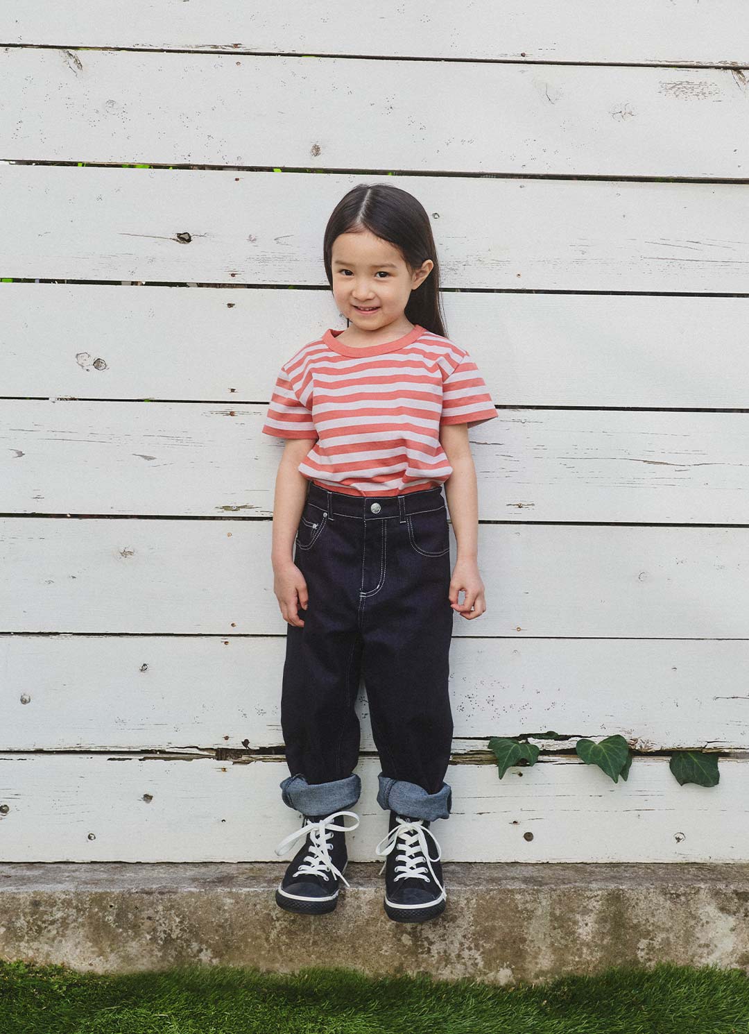 ゆったりとしたシルエットのデニムは、長くはけるサイズ感がグッド。白ステッチがアクセントになった春らしいインディゴカラーは、ボーダーTと相性抜群!
