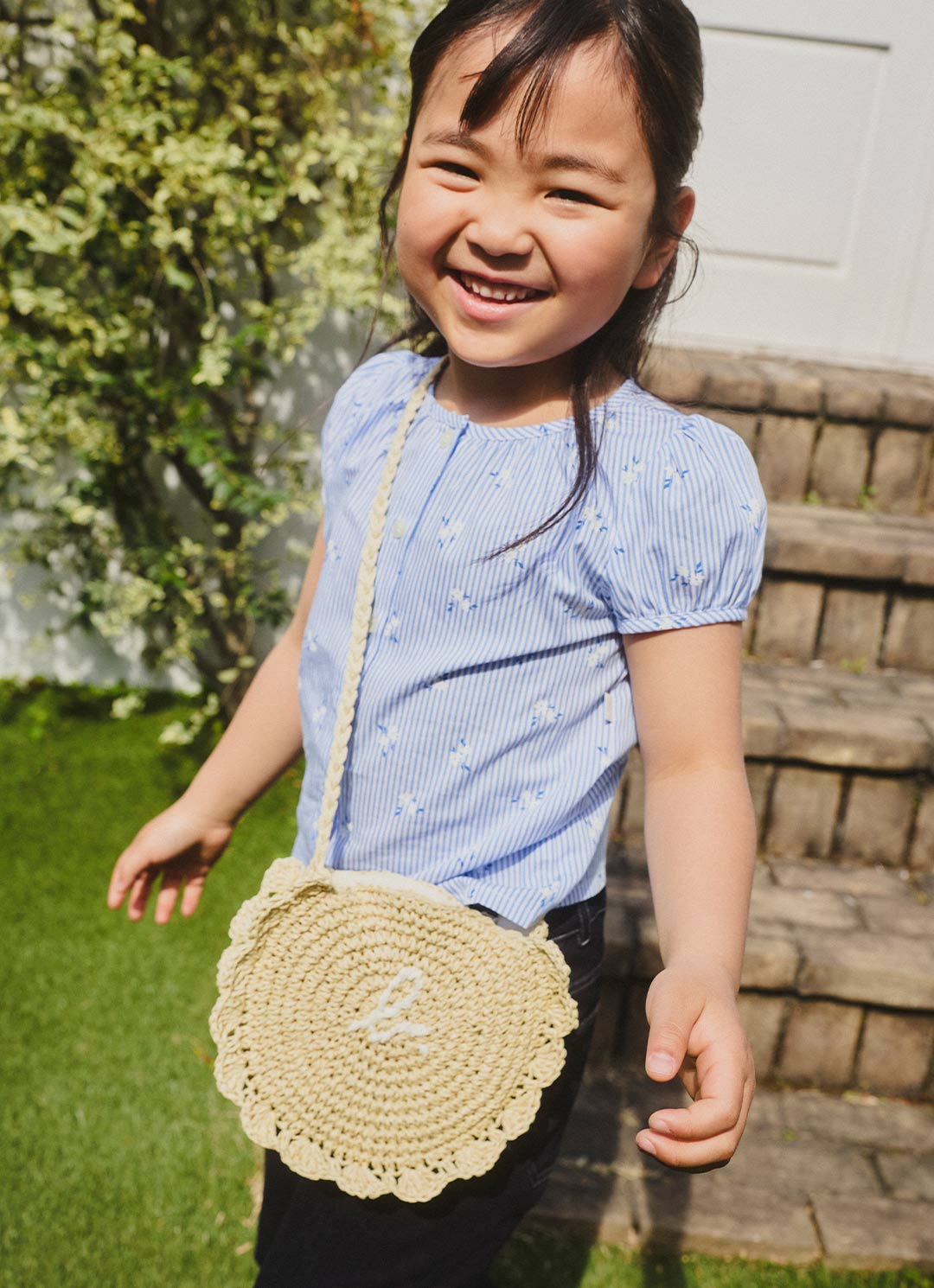 小花が散らされたストライプ柄のブラウスは、パフスリーブも相まって可憐なムードたっぷり。涼やかな素材のラウンドショルダーバッグをかけて、洒落っ気たっぷりに着こなして。