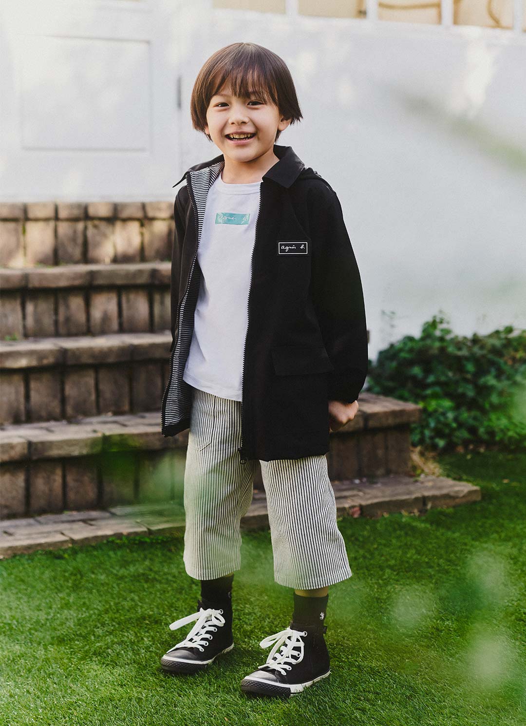 ブルゾン¥19,800、Tシャツ¥6,820、ハーフパンツ¥9,900、スニーカー(agnes b. x CONVERSE)¥13,200、ソックス=参考商品