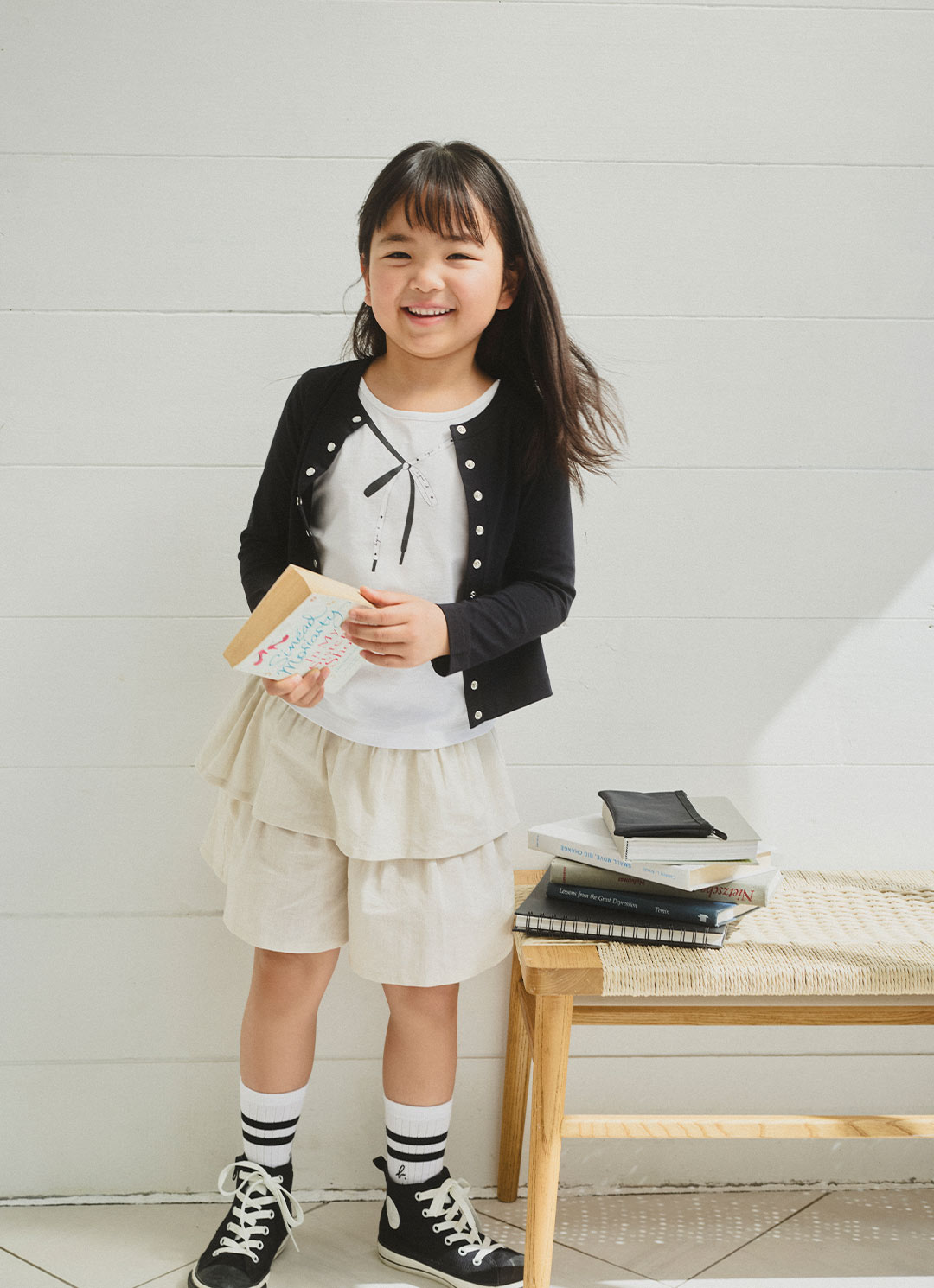 カーディガン¥11,550、Tシャツ¥7,480、キュロット¥13,750、スニーカー(agnes b. x CONVERSE)¥13,200、ソックス¥1,980