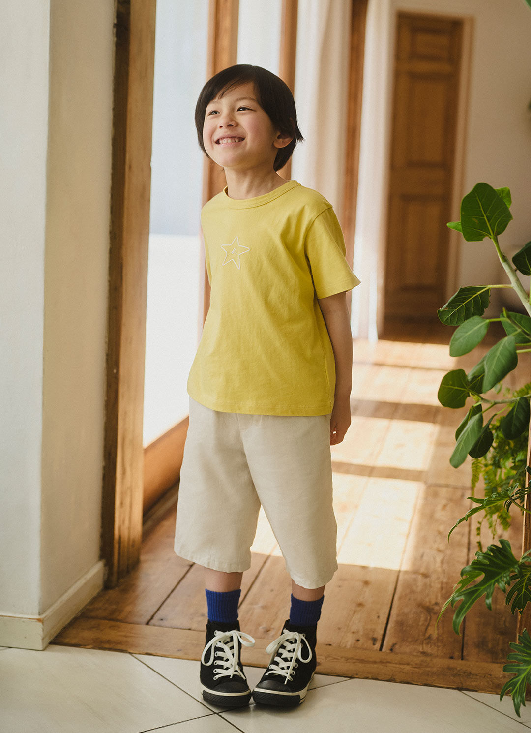 パッと目を引くイエローのTシャツは、フロントのスター刺繍がさりげないアクセント。コーデが一気に春めく、チアフルなキッズスタイルにぴったり。