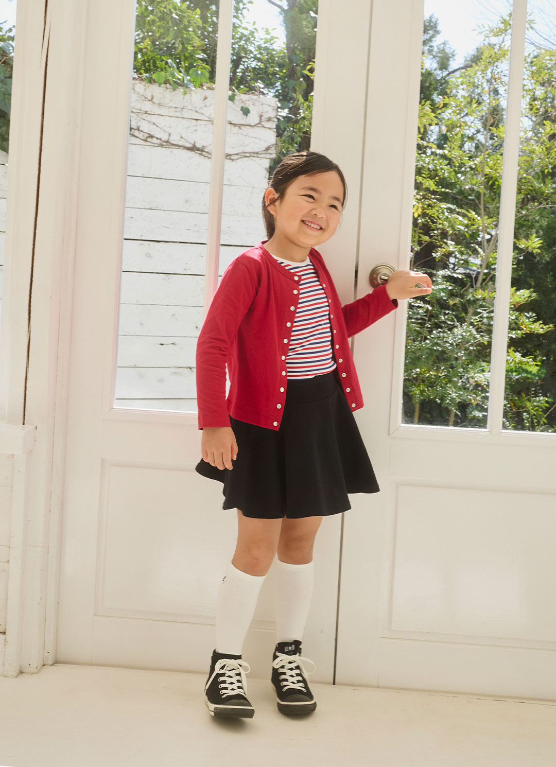 カーディガン¥11,550、ボーダーTシャツ¥8,800、スカート¥10,450、スニーカー(agnes b. x CONVERSE)¥13,200、ソックス¥1,980