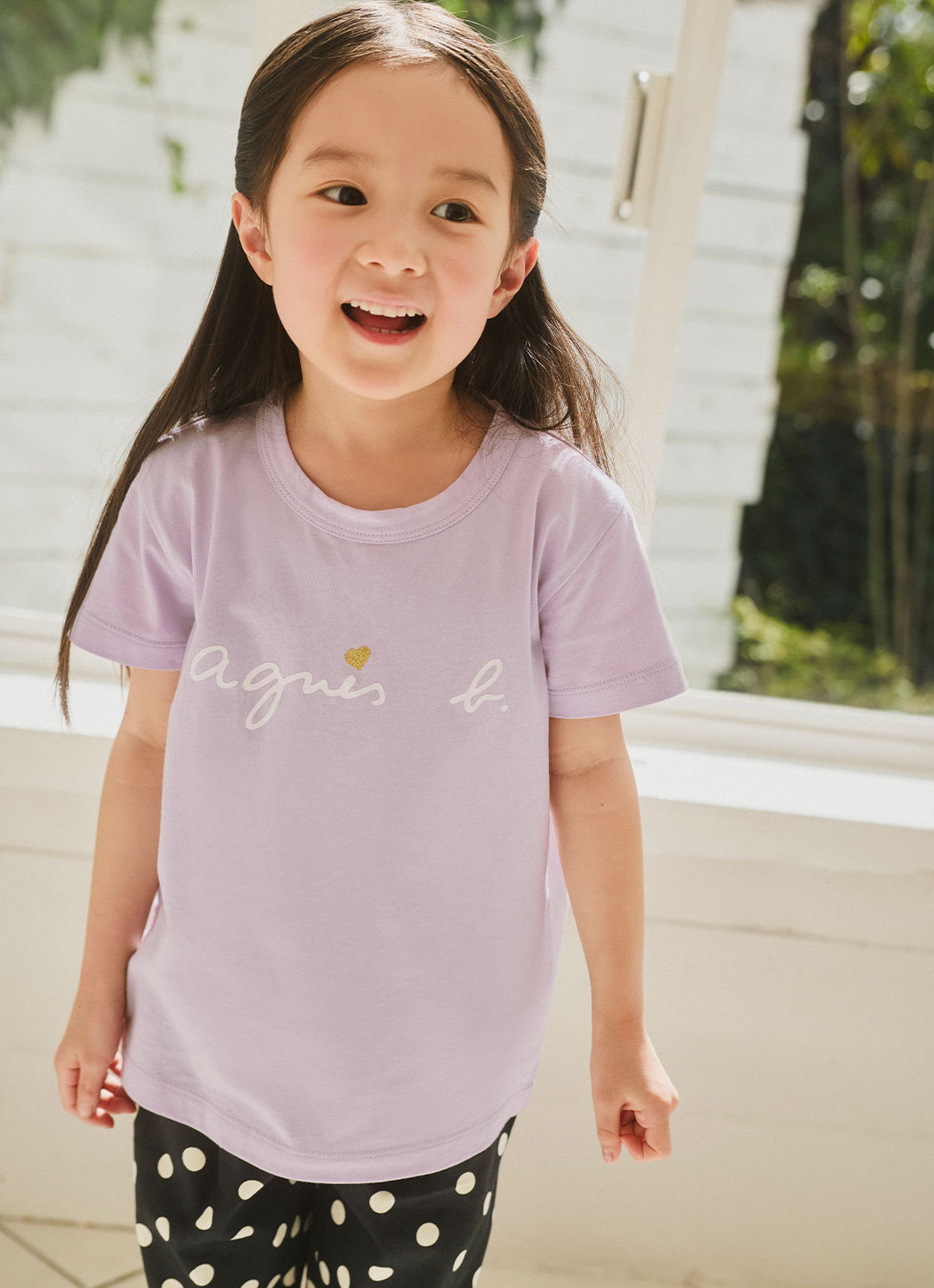 やさしいラベンダーカラーに、ブランドロゴと小さなゴールドハートがキラリと光るTシャツ。ドット柄パンツとあわせて、とことんチャーミングに。