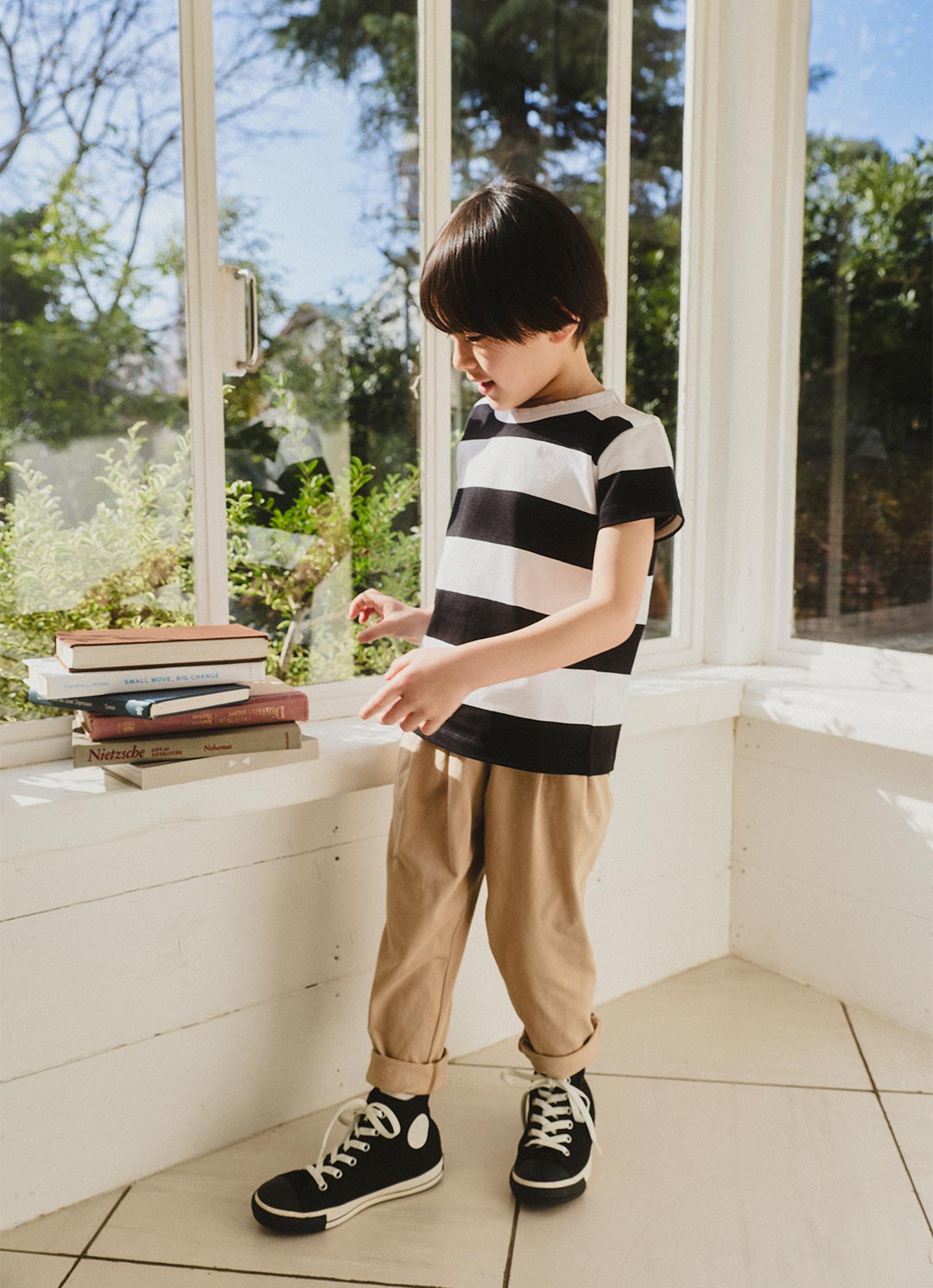 Tシャツ¥7,700、パンツ¥9,020、スニーカー(agnes b. x CONVERSE)¥13,200