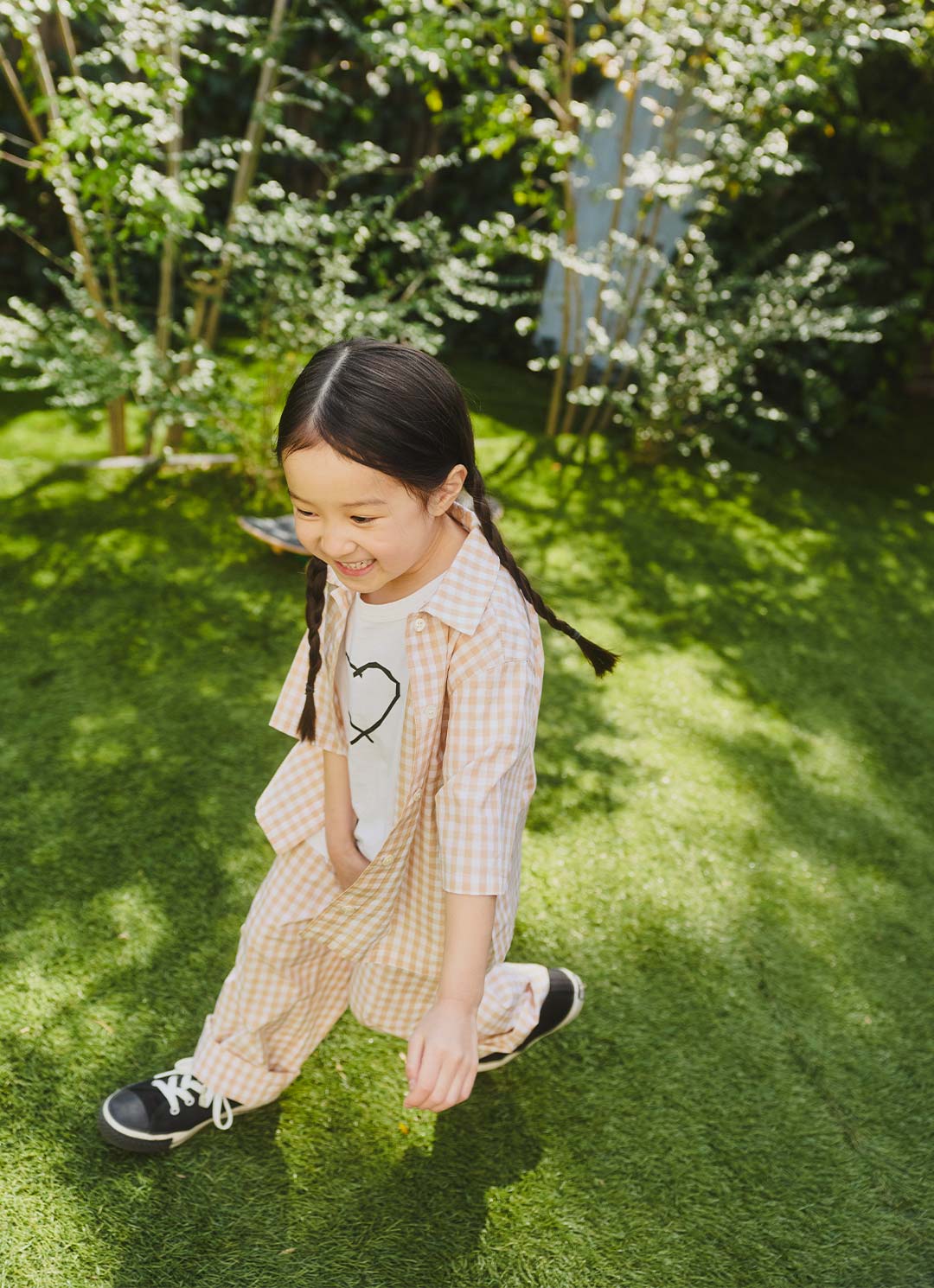 ナチュラルカラーのギンガムチェックをセットアップで。柄はカジュアルでも、程よく張り感のあるシルエットが美しく、お出かけをアップグレードしてくれる。