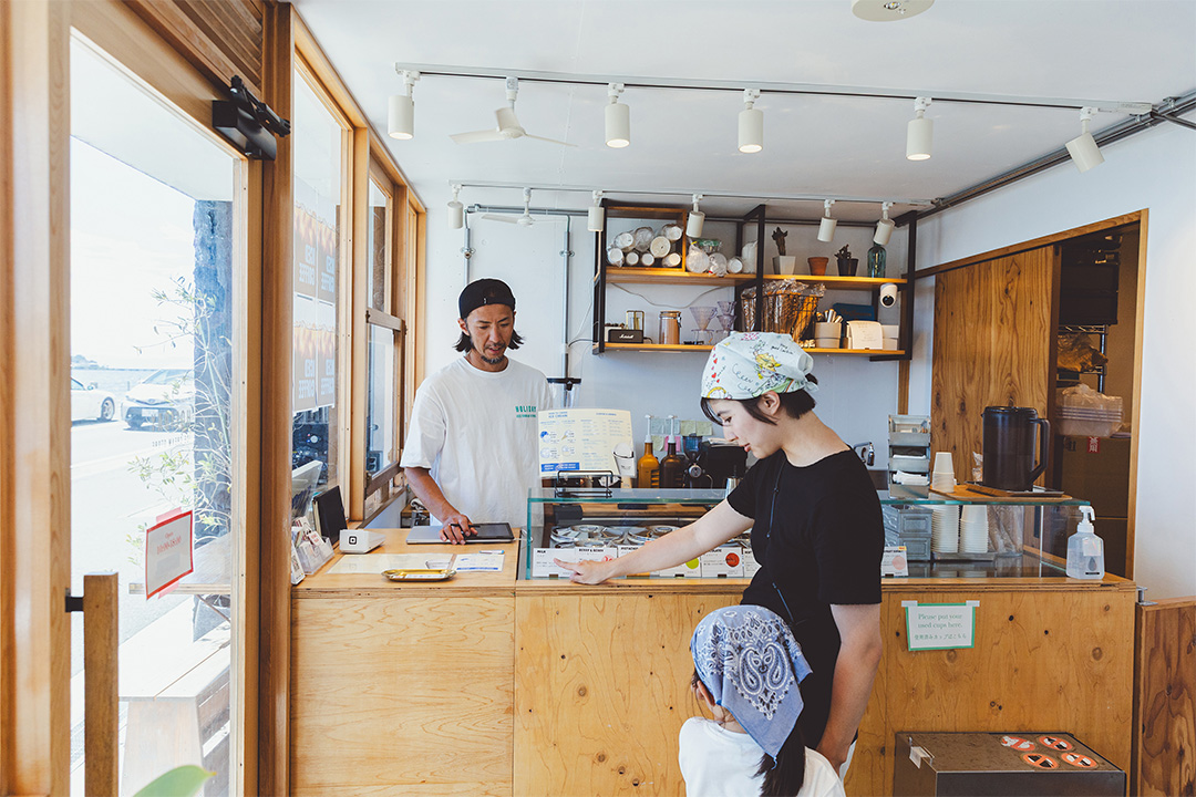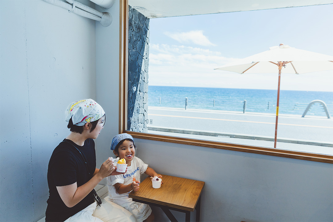 もぎたての果実を丸かじりするくらいジューシーなソルベや、上品な甘さのアイスクリーム。きんたろう牛乳、キウイや蜜柑など積極的に地産食材を使っているのだとか。窓から見える水平線が主役といわんばかりにシンプルな店内で、しばしのクールダウンのつもりがつい長居に。