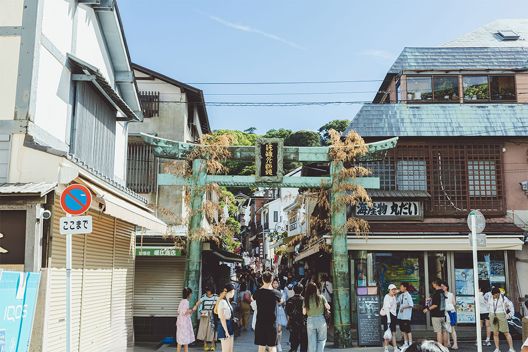 まるで神社に会釈するかのように鳥居の前をゆっくりと横切る江ノ電。参道が踏切につながるミラクルな光景が珍しく、ちょっとした撮影スポットに。こちらのみならず、江ノ電の線路と道路の間にフェンスなどの仕切りがありません。だから吃驚するほど人と電車の距離が近い! 迫力に押されて写真をついつい撮りすぎてしまいます。