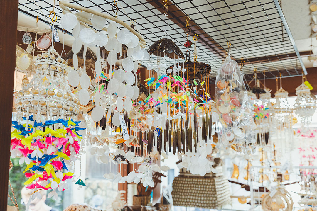 シャラシャラと涼し気な音が鳴る貝殻のオーナメントがずらり。