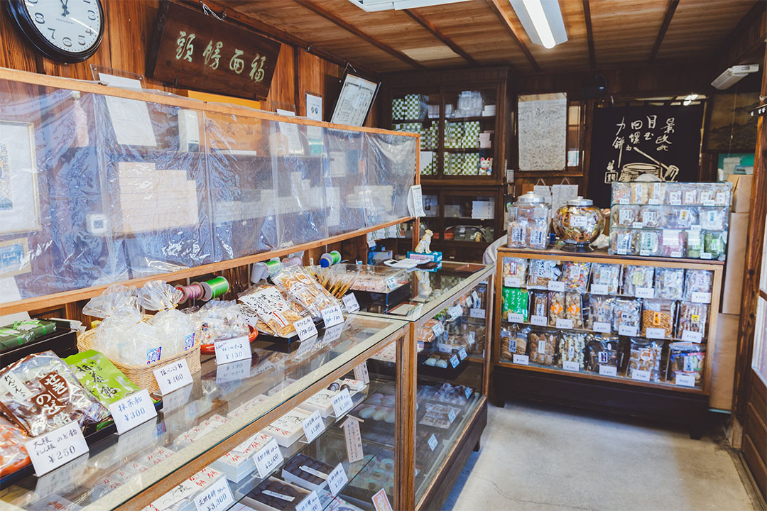店内には自家製手づくりの和菓子や仕入れたおせんべいなどが並ぶ。