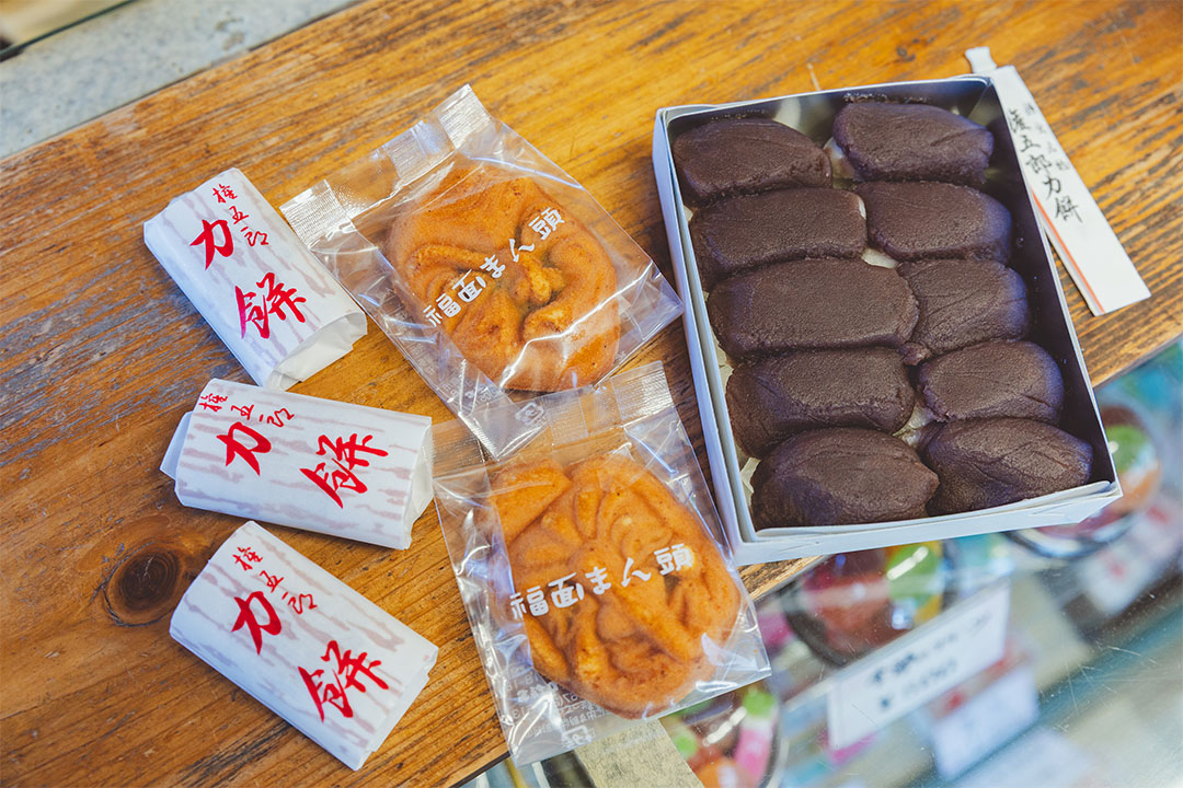 (右から)名物「権五郎力餅」(10個入り¥750)、福面まんじゅう(1個¥200)、求肥力餅(1個¥100)。