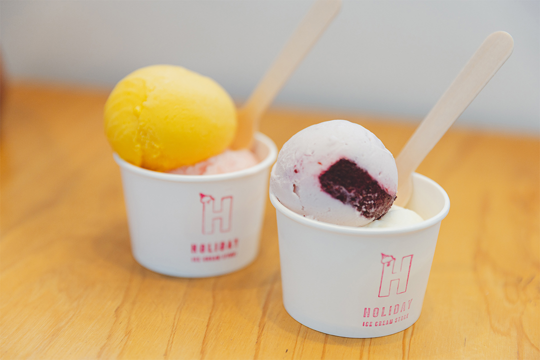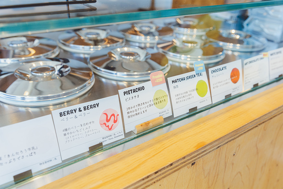 アイスクリームはすべて店内で手づくりしている。旬のフルーツを使った夏にぴったりのアイスクリームも。