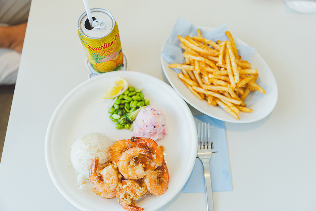 ガーリックシュリンププレート(¥1,700)とフレンチフライ(¥700)をふたりでシェア。