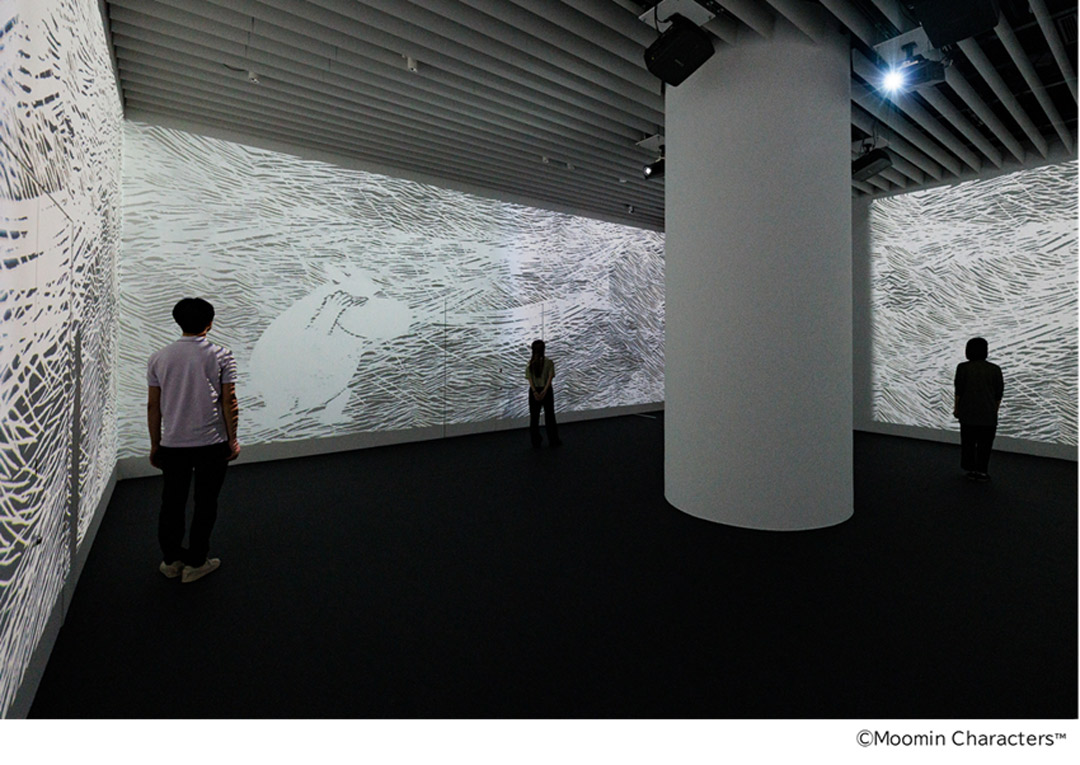 「ムーミン」小説の挿絵をモチーフにした映像エリアでは、まるで絵本の世界に迷い込んだような没入感を味わえる。