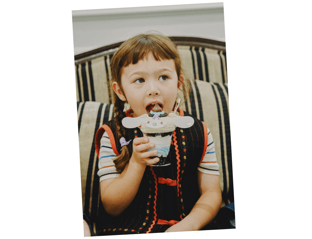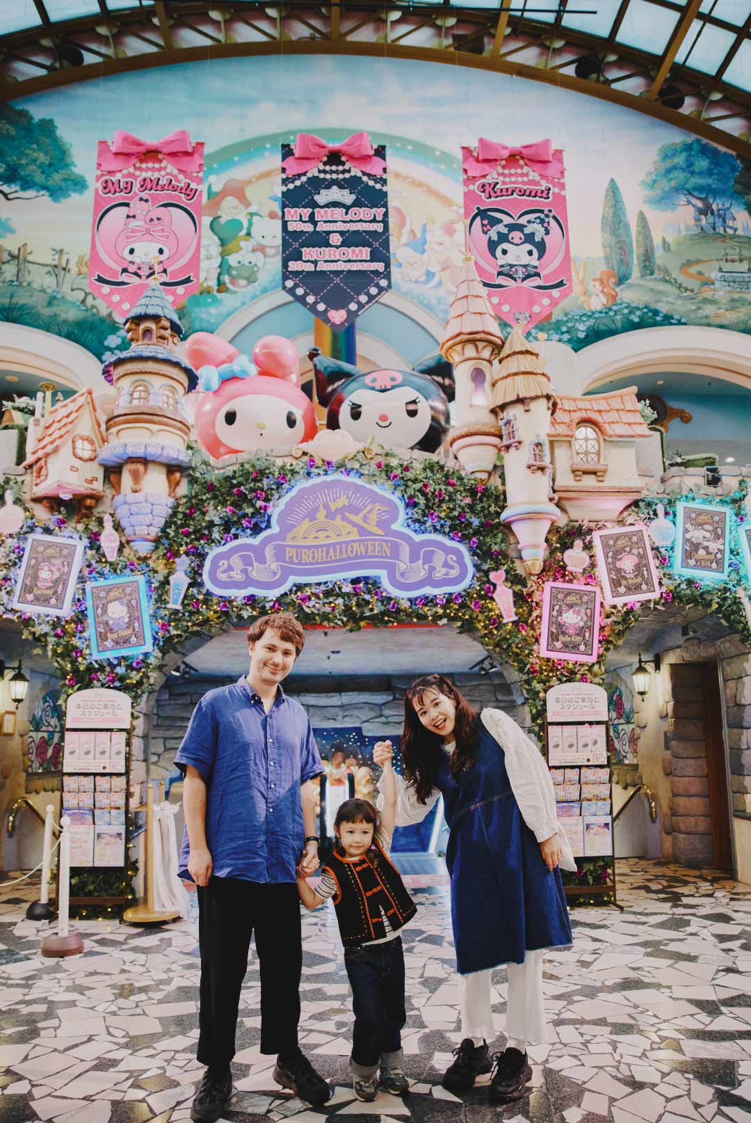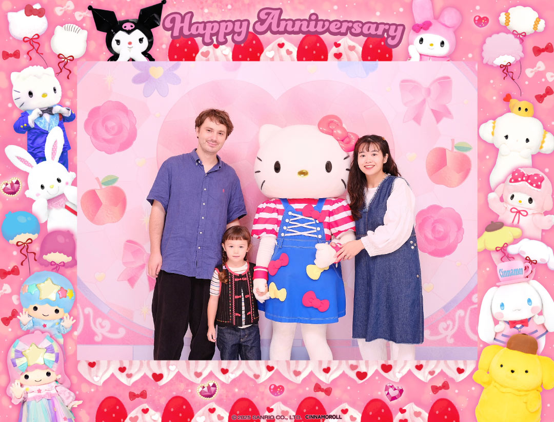 ピューロランドに来るのは、これで4回目! ショーを見て、いろいろなキャラクターとグリーティングするのが定番コース。家族でプリントシールを撮るのも必須! デイジーちゃんの推しはクロミとハローミミィ、ママはマロンクリームとコロコロクリリン、パパはバッドばつ丸とけろけろけろっぴ、ファミリー揃ってサンリオ好き♡