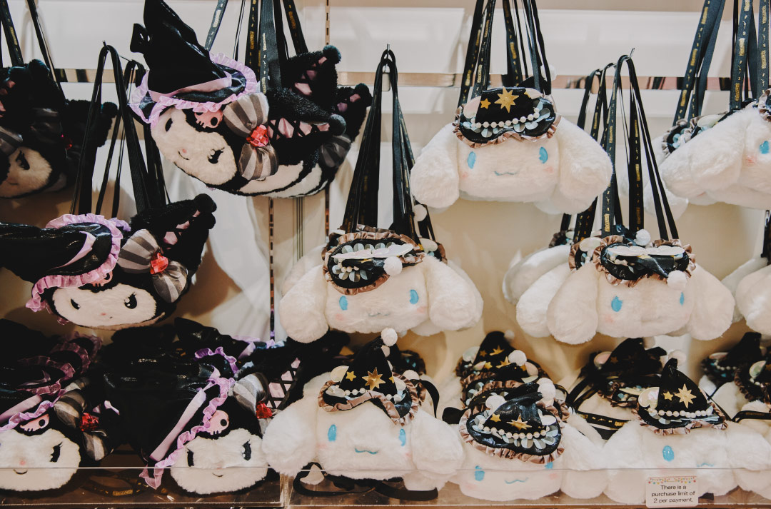 魔法使いコスチュームが可愛いぬいぐるみパースは、クロミ、シナモロール、ウィッシュミーメルの3種展開(各¥3,740)。後ろには透明ポケットとファスナー式の小物入れ付き。