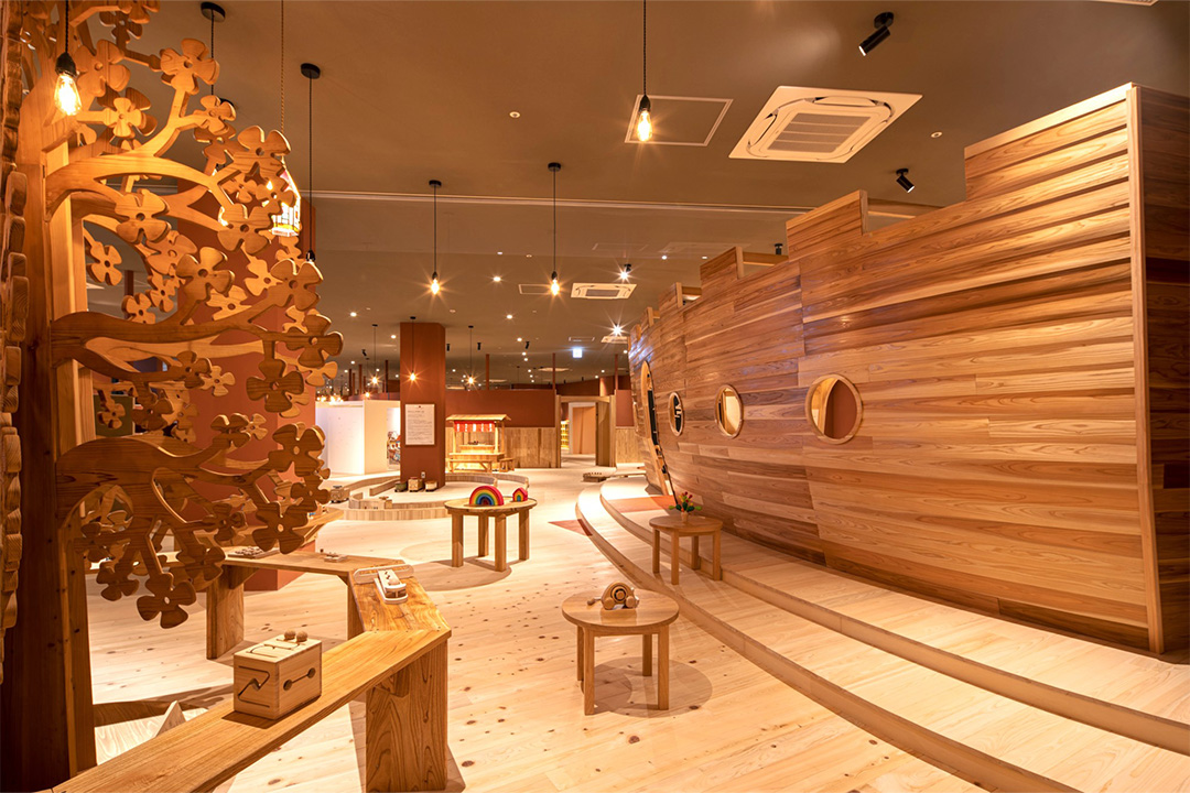 3歳未満の親子専用の「赤ちゃん木育ひろば」は、木のたまごプールが大人気! 棚いっぱいにあるオモチャから自分で好きなものを見つけよう。スギの床はハイハイ期のベビーにもおすすめ。