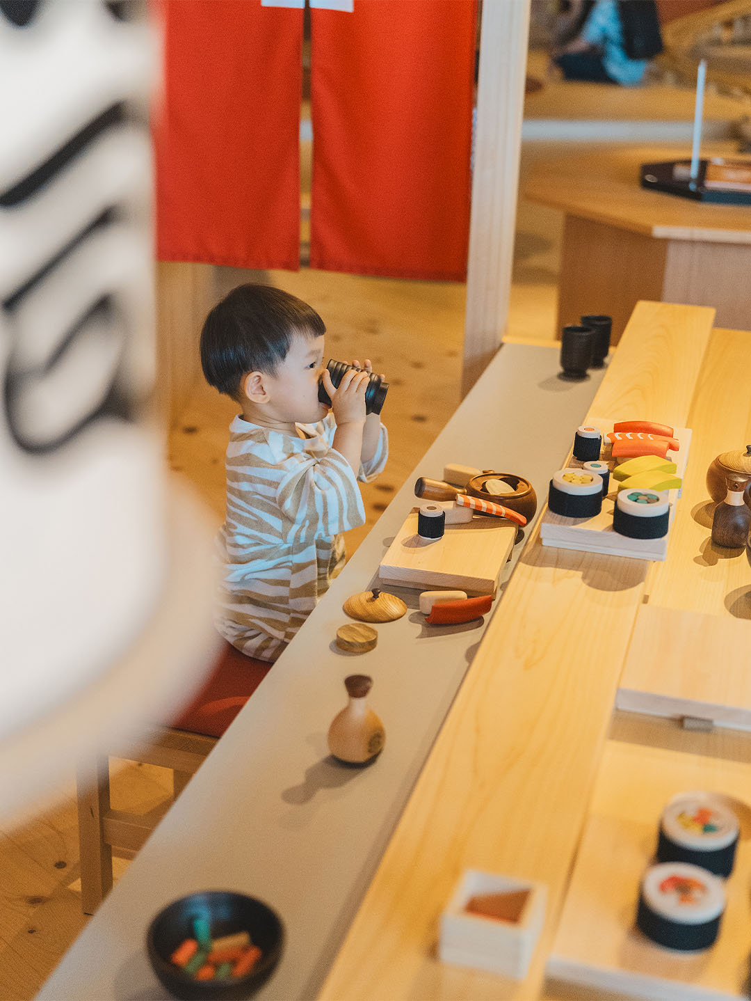 「おもちゃのまち」は、博多ラーメンやお寿司、アイスクリーム屋さん、博多銘菓の小屋など木でつくられた本格的なままごとセットがならぶエリア。ここでしか遊べないオリジナルのオモチャやけん玉、コマなど昔ながらのスキルトイも揃う。