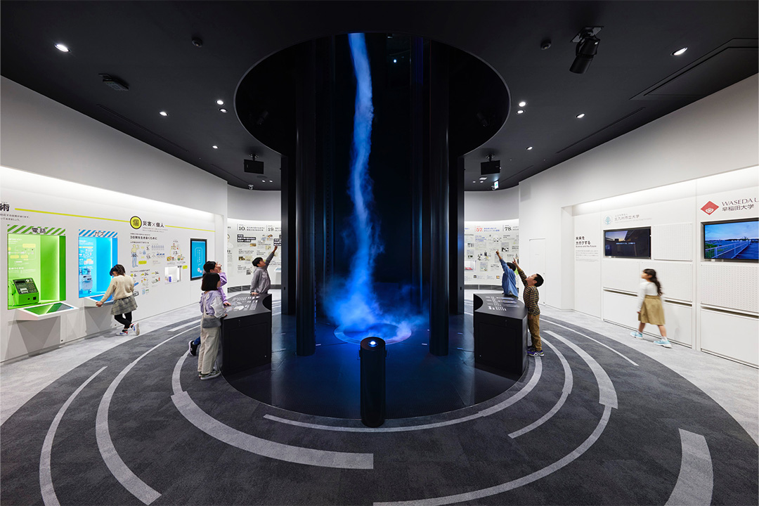 1階の「サイエンスLABO(常設展示室)」では、国内最大の大型竜巻発生装置(高さ約10m)で、空気の渦を観察することができる。
