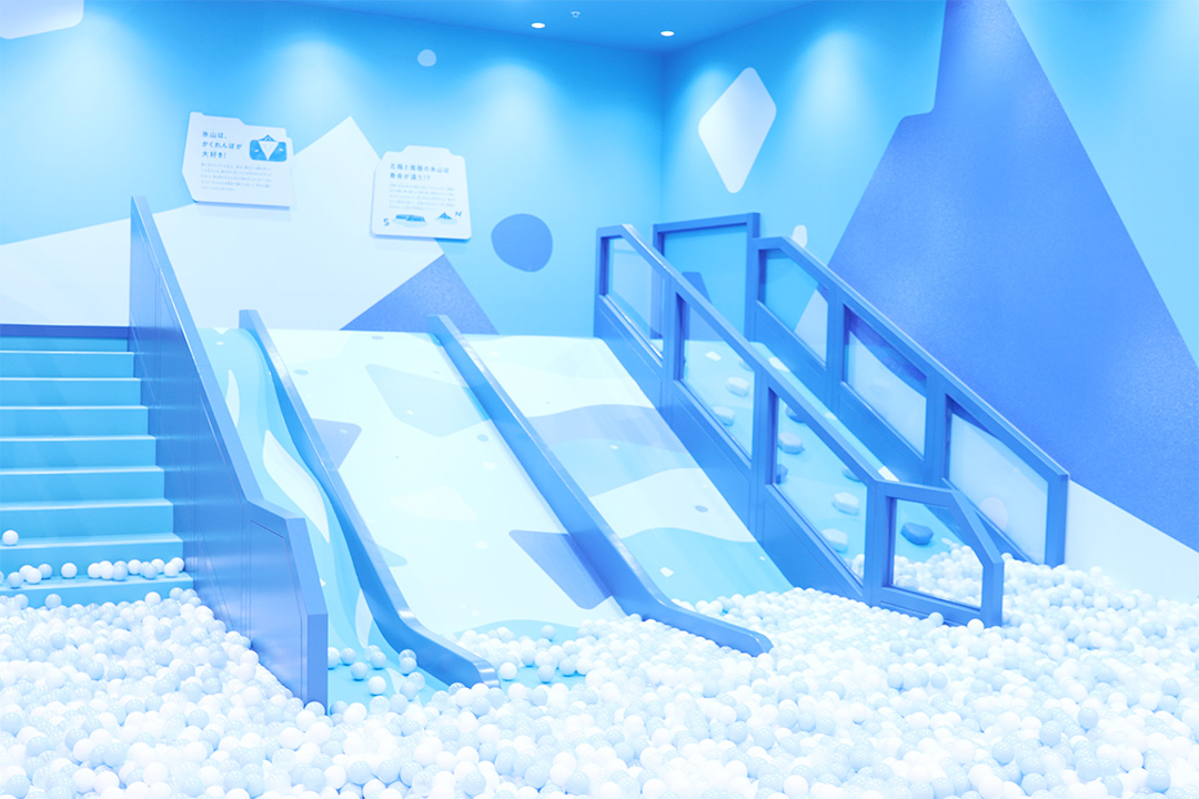 氷山をイメージした「氷山スライダー」を滑ったらそのままボールプールの海にダイブ!