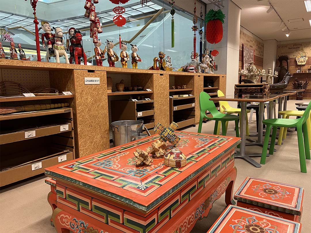 「こんなことやってみたいけん(みたいから:福岡方言)」という想いを叶えてくれる「みたいけんラボ」。アジア各地のオモチャや楽器、衣服、生活の道具などに触れて異文化を体験しよう。民族衣装を着て写真撮影もOK!