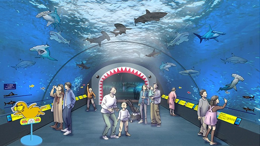 まずはサメの口をイメージしたエントランスをくぐり抜け、複数種のサメが泳ぐ館内のアーチ水槽ではさまざまな角度からサメをウォッチング。
