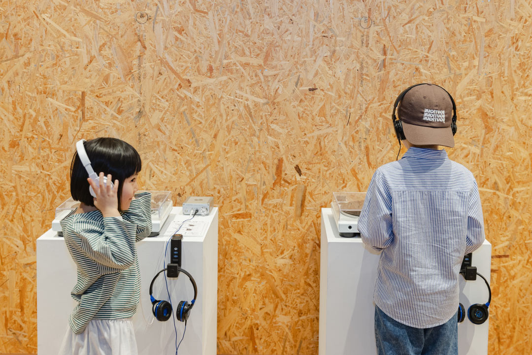 ターンテーブル(レコードプレーヤー)1台につき、ふたつのヘッドホンをご用意。親子やきょうだい、友だち同士で、同じ音楽を聴いて盛り上がろう!
