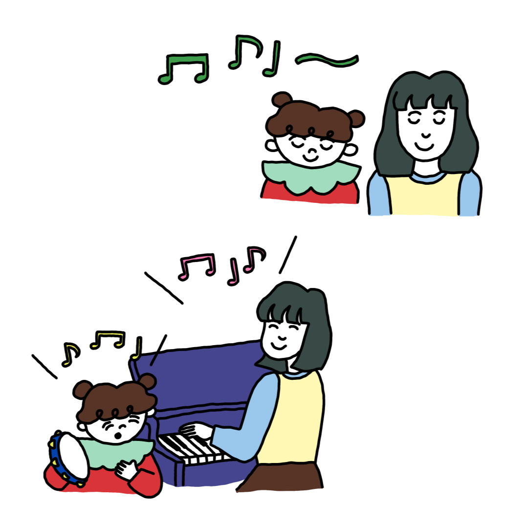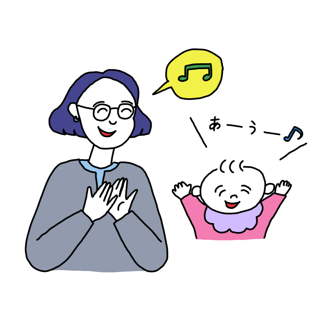 音の処理を司る脳の領域と言語を司る領域は、重なり合っている部分があるため、音にたくさん触れることが、言語処理や言葉の獲得にプラスに働くと言われています。リズムも言語の習得に役立つと言われているため、音楽を聴かせてあげることも有用ですが、手を叩くといった簡単な音遊びをしてあげるのもいいでしょう。
