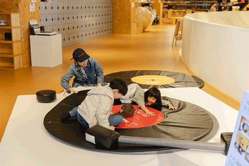約2mサイズの、人が乗れるターンテーブル(レコードプレーヤー)型の遊具。トーンアームを動かしたり、レコードを付け替えたり、みんなで持ち上げて回したりすることで、遊びながらレコードならではの動きを体験。 レコードの上に乗って歌ったりしながら、その場で生まれる音を自由に楽しもう!