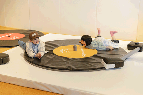ターンテーブル(レコードプレーヤー)で、レコードが聴けるブース。レコードの溝を針がなぞると音楽が流れるという、アナログならではの音が楽しめる。巨大ターンテーブル遊具で遊びつつ、本物にも触れられるのがポイント。大きな穴が開いたドーナツ盤や、顔よりも大きな12インチレコードに実際に触れることができ、サイズの違いも楽しめる。