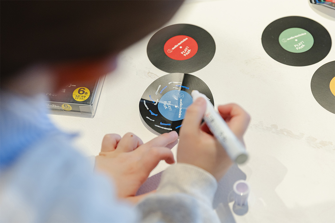 4/26(日)までのイベント期間中に、アンケートに回答すると、オリジナルの「レコードこま」をプレゼント。 レコード型遊具と同じデザインで、参加の記念にもぴったり。ペンで模様を描いて自由にアレンジすることもでき、回したときに色が混ざって、見た目も楽しい♪