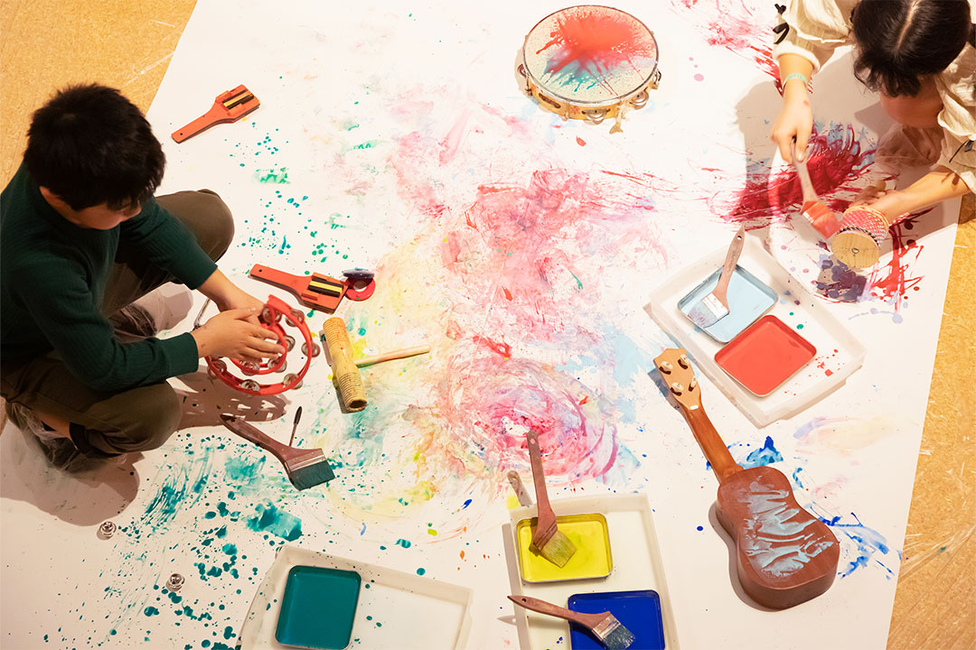 3/28(土)に開催する「音筆」は、楽器に絵の具で色をつけて、目に見える「音のカタチ」として描く特別イベント。楽器の形状で模様を描いたり、打楽器の振動で模様をつくったりして、大きな絵が完成。楽器は使わなくなったものを利用。家で眠っていた楽器が子どもたちの遊び道具に!