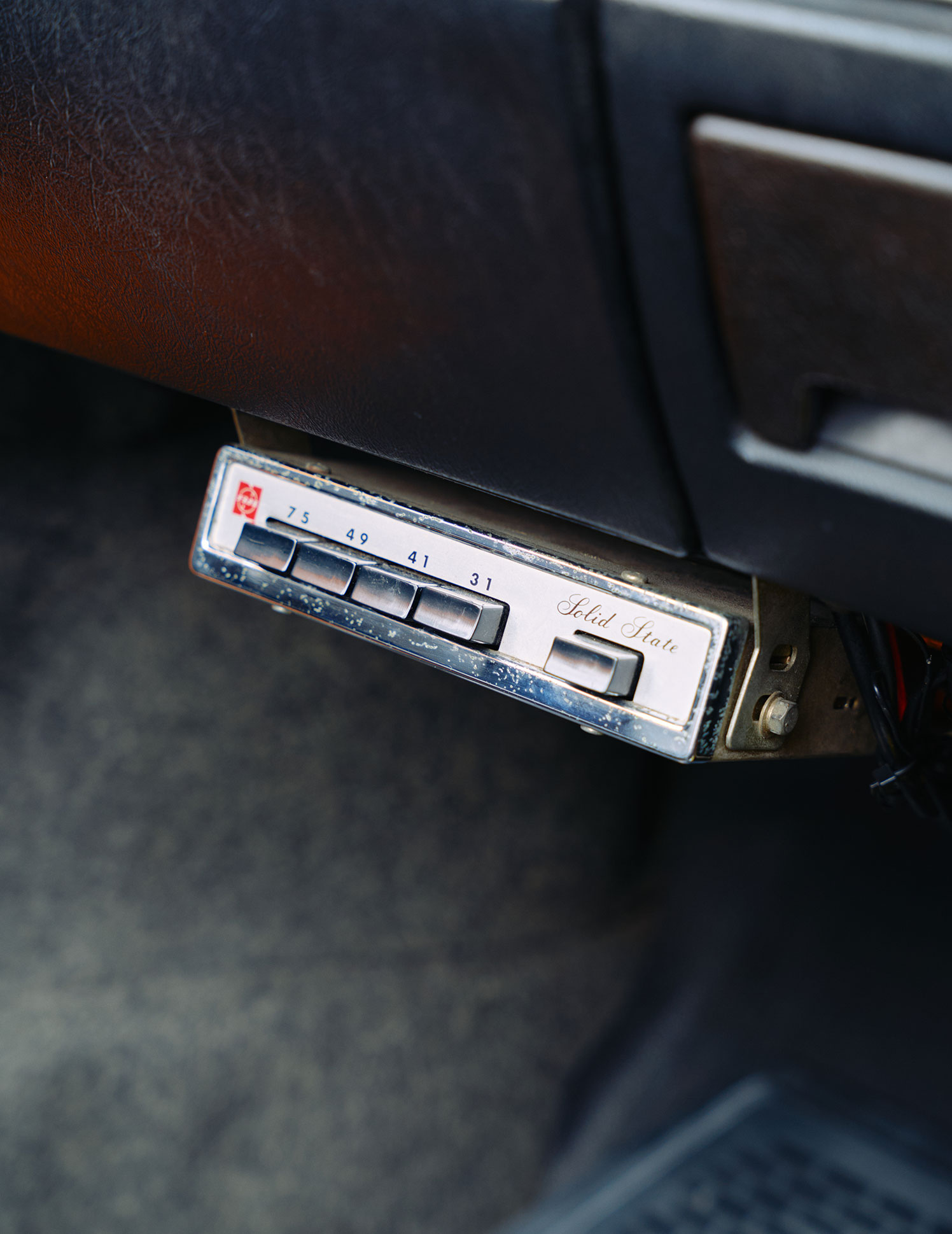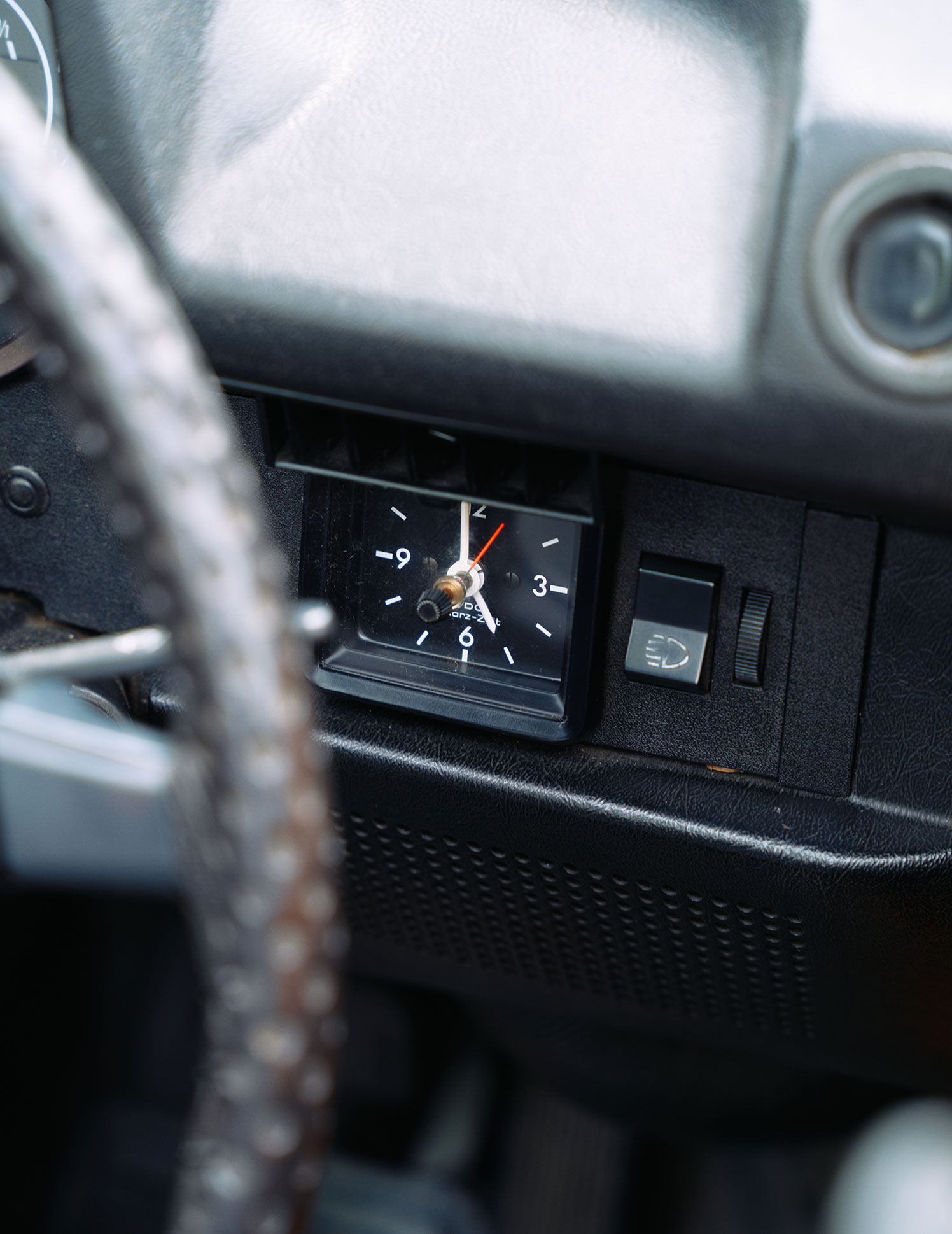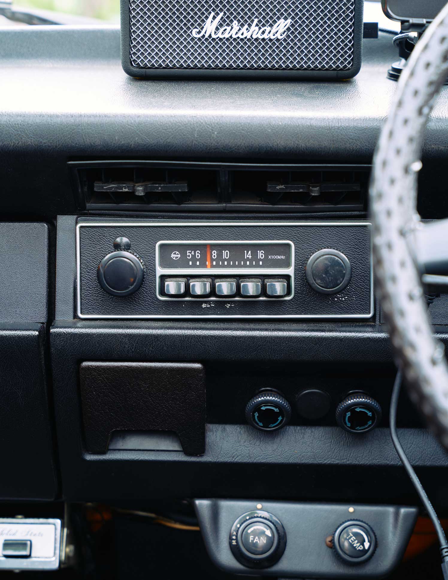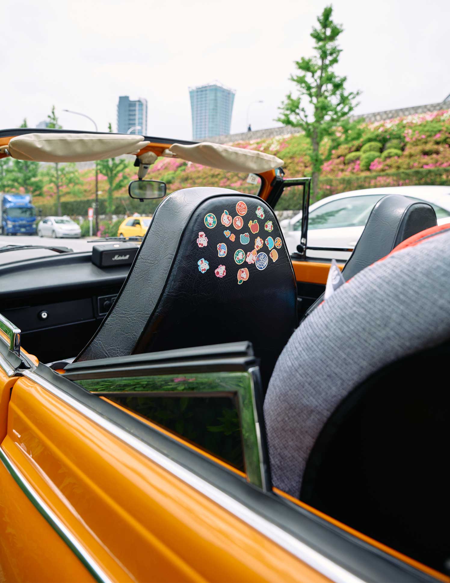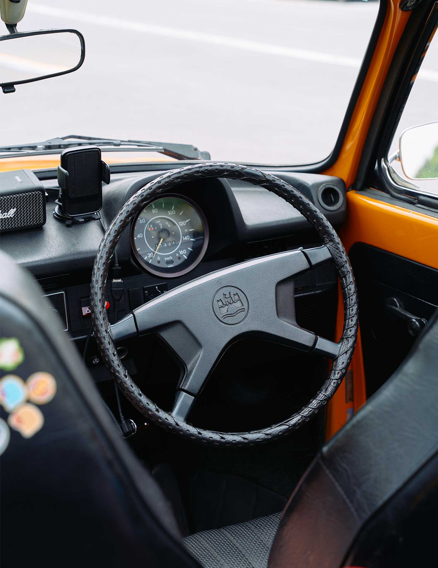 オーディオプレイヤーや時計が備わったレトロなデザインがセンス抜群の車内。前部座席にはキキちゃんが貼ったシールが。子どもらしい味つけがなんともキュート!