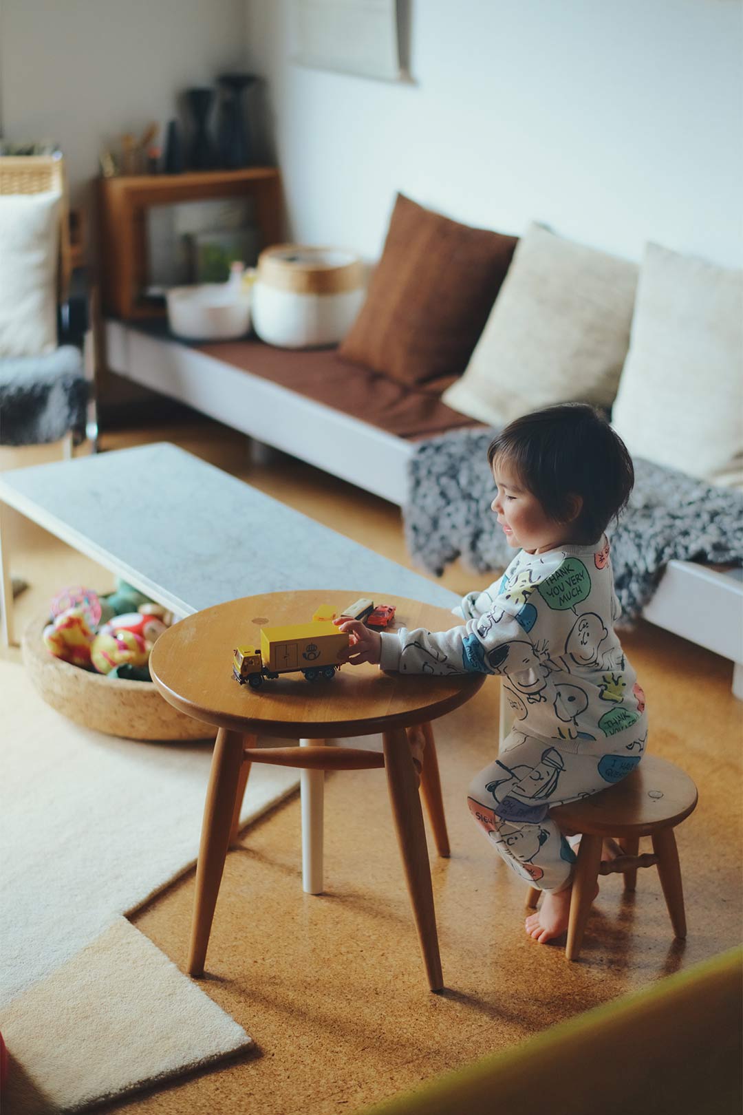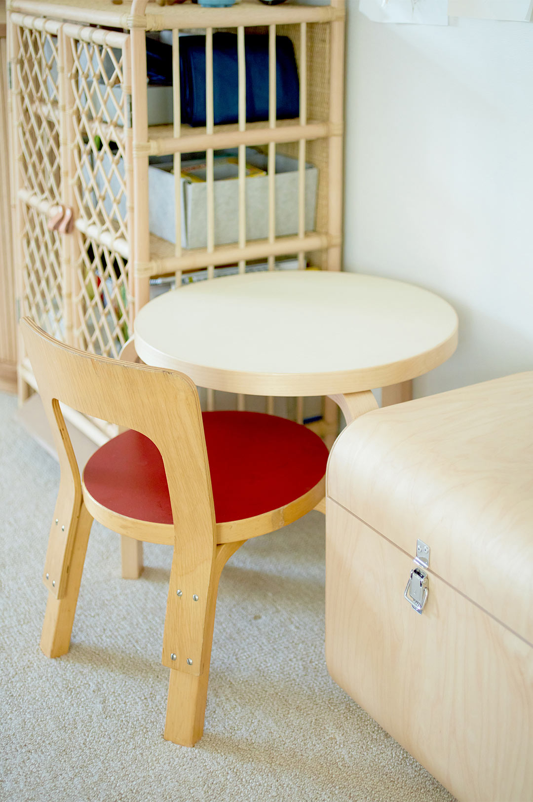 小さなテーブルと椅子は〈アルテック〉。「テーブルは〈Scope〉別注品で、椅子はヴィンテージで購入。椅子の足を少しカットしてリメイクしました。子どもがテーブルセットとして使わなくなったら荷物置きにしたり、サイドテーブルにしたり、新たな用途で使い続けます」