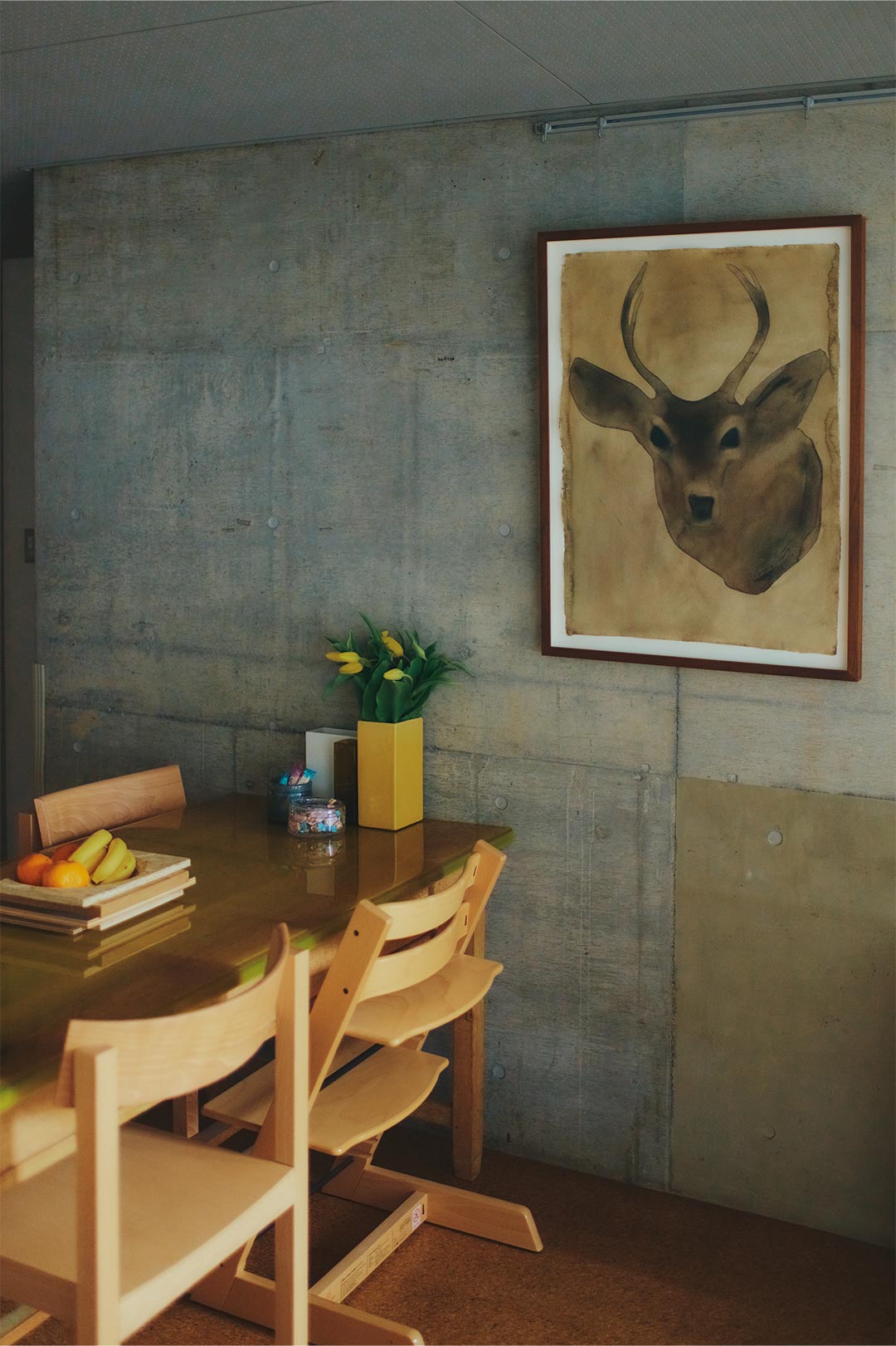 息子さん用のダイニングチェアは、〈ピーター・オプスヴィック〉がデザインした〈ストッケ〉のもの。座面の高さや奥行きを調整することができ、大きくなっても使い続けられるところが◎。ダイニングテーブルの隣にはお気に入りのオブジェやアートピースを並べたディスプレイスペースも。