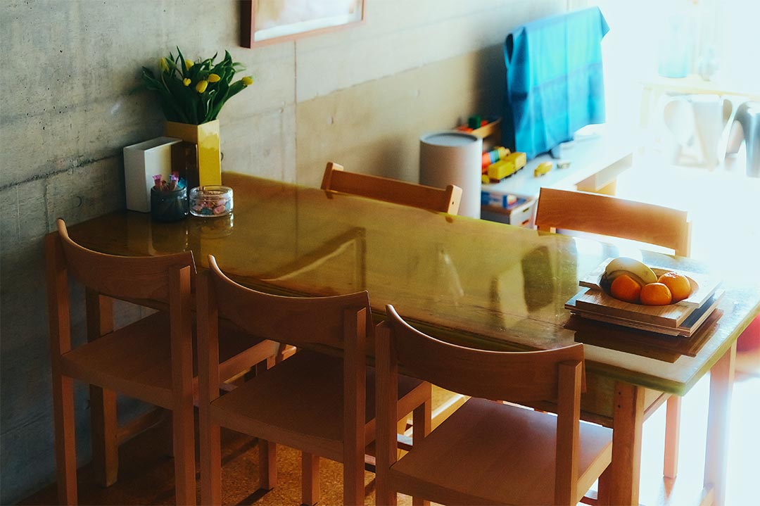 恵比寿の〈SOMEWHERE TOKYO〉で購入した、〈スキーマ建築計画〉の長坂常さんが手がけたダイニングテーブル。凹凸のあるアンティークテーブルの表面をエポキシ樹脂で覆ったユニークなデザイン。「ダイニングテーブルはこれと言えるものになかなか出会えず、購入するまで5年ほどかかりました」。チェアはイタリアの〈マティアッツィ〉をチョイス。