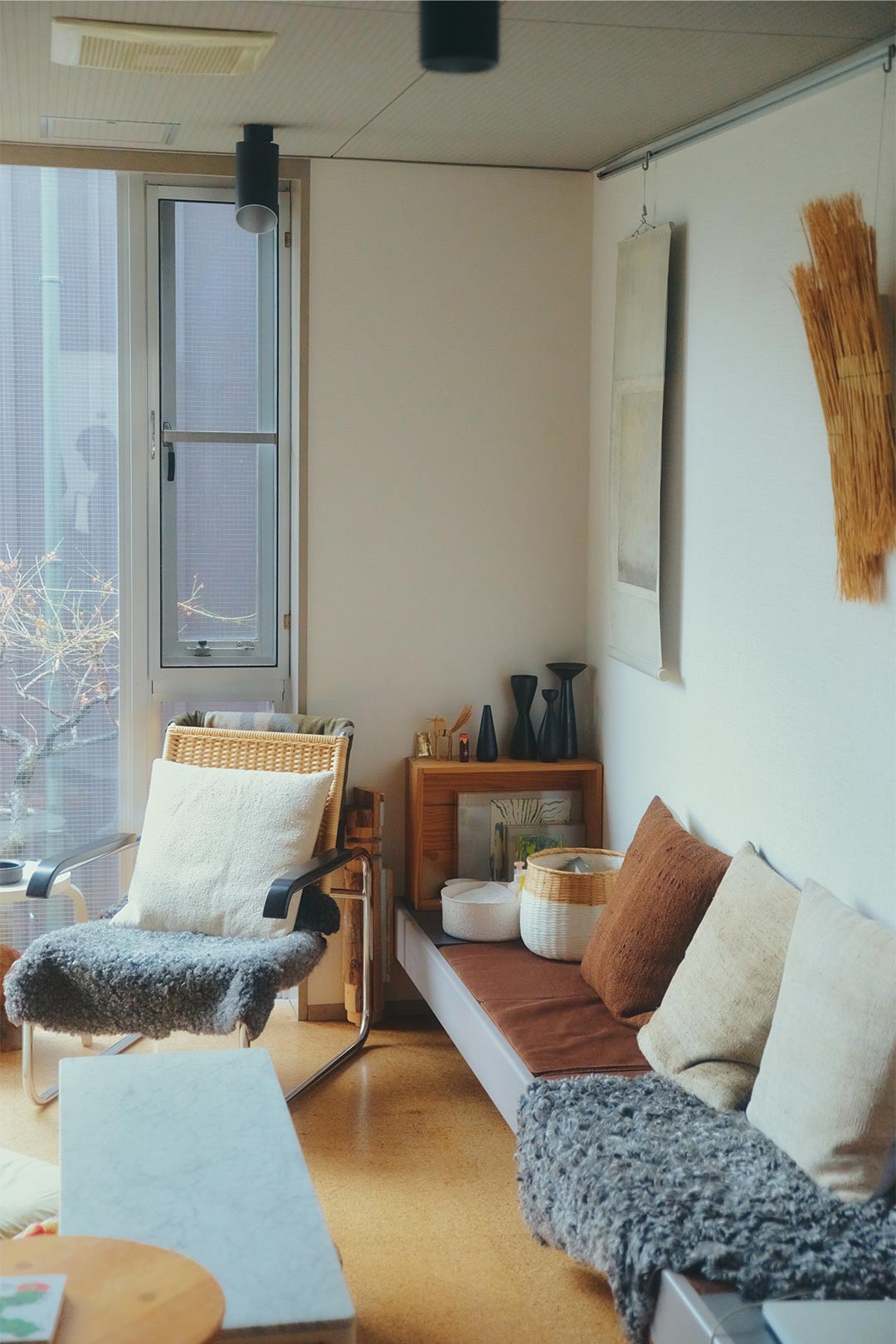リビングの壁一辺には、造り付けのローカウンターが。一部クッションが埋め込まれており、ベンチとしてデザインされている。アームチェアは〈トーネット〉の貴重なヴィンテージ。「アームチェアの頭上にある窓辺のライトだけ、明かりが外へ漏れないように、傘が斜めにカットされています」。手前のウォールスカルプチャーは、藁作家のARKOさんの作品。