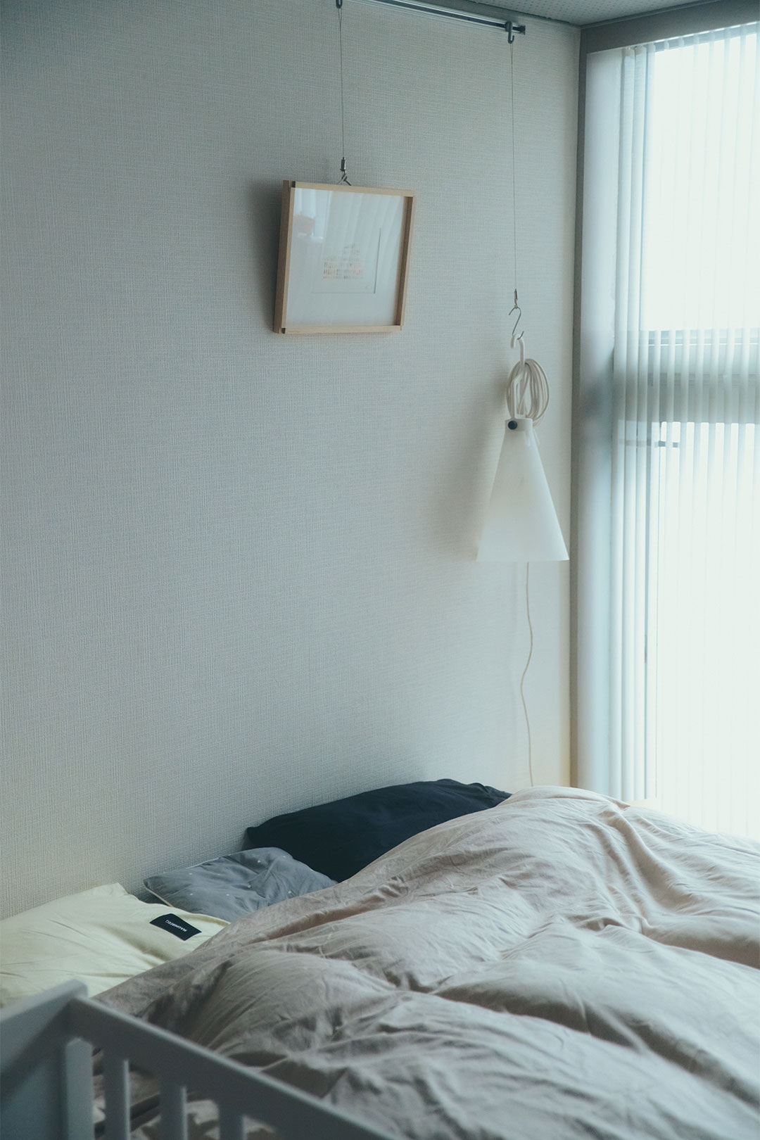 ベッドサイドに吊るされたライトは、モダン照明のトップブランド〈フロス〉のもの。ベッドリネンはスウェーデン・ストックホルム発のベッドウェアブランド〈マグニバーグ〉のものを愛用。