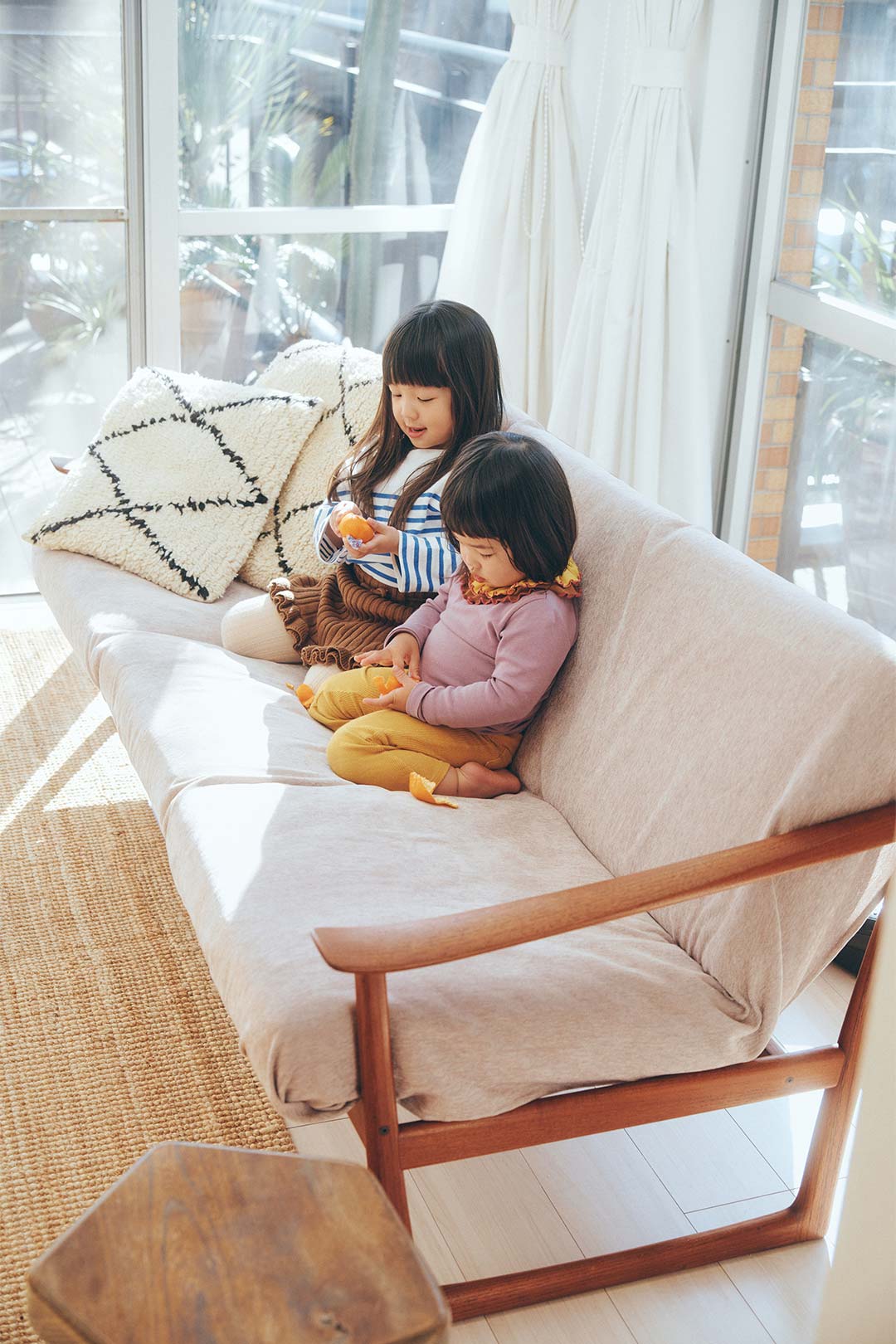 〈ピーターヴィッツ&モルガード〉の3人掛けソファは、チークの無垢材を贅沢に削り出したダイナミックなフレームが特徴的。「子どもたちがなにかこぼしてもすぐ洗えるように、また猫の爪研ぎ防止のためにもカバーは必須です」