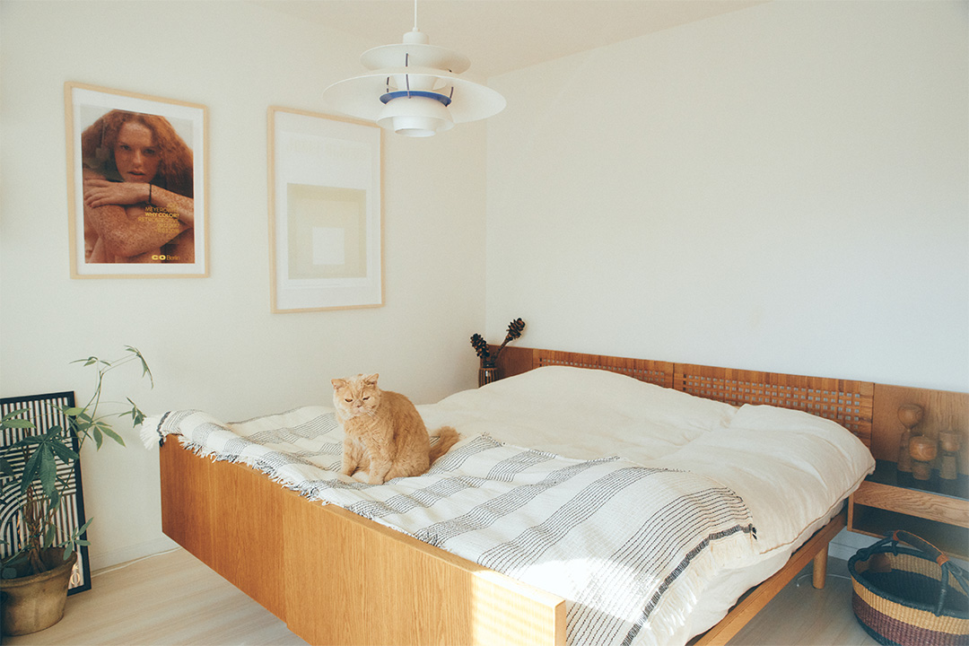 落ち着いた色味で統一されたベッドルーム。ベッドは〈ハンス J. ウェグナー〉のヴィンテージ。籐編みのベッドヘッドに、ナイトテーブルが付いたなかなか珍しいモデル。照明はもともとダイニングで使っていた〈ルイスポールセン〉のPH5。「寝室はあまり採光を必要としない空間なのでペンダントライトでも十分。今後はよりベッドまわりを充実させていきたいです」