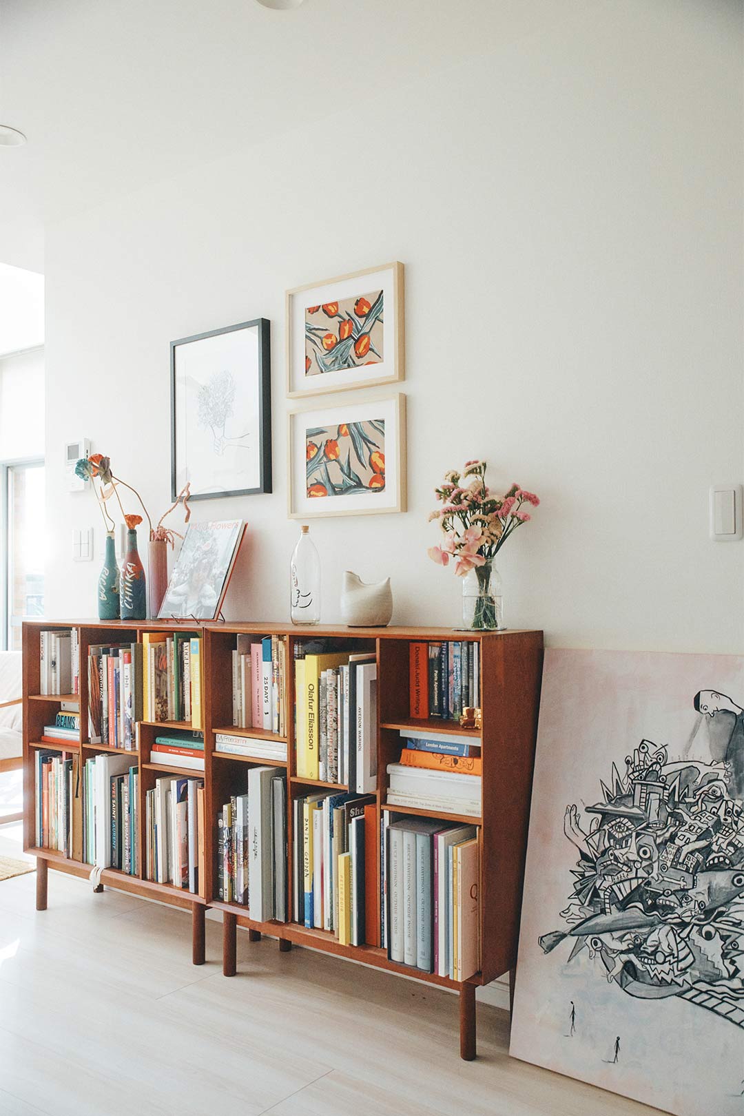 ダイニングとリビングをつなぐ廊下には、〈ピーターヴィッツ&モルガード〉のヴィンテージブックシェルフが。棚上には“花”にまつわるものをディスプレイ。「娘ふたりとも名前に花がついているから、わが家にとって特別なモチーフ」。壁にかけている絵はtokunaga keiichiroさん(左)と、IZUMIDA LEEさん(右)の作品。