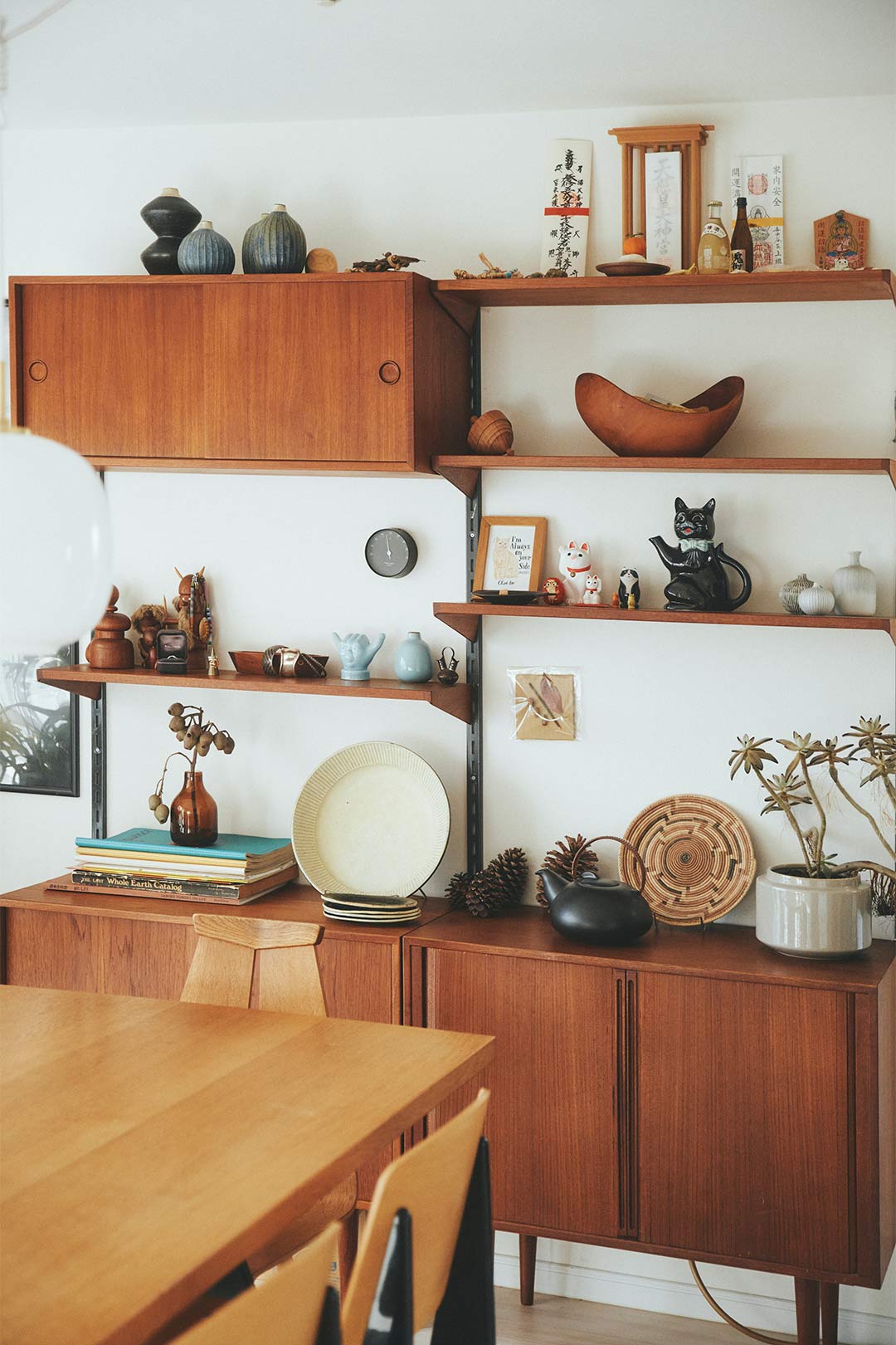 〈カイ・クリスチャンセン〉の大きな飾り棚には、いろんなテイストの雑貨や器をミックス。収納に悩む大皿は、スタンドを使って魅せるインテリアに。「飾っている白いお皿は、額賀章夫さんの笠間焼。オープンスタジオで購入しました。来客が多いわが家で大皿は必須です!」