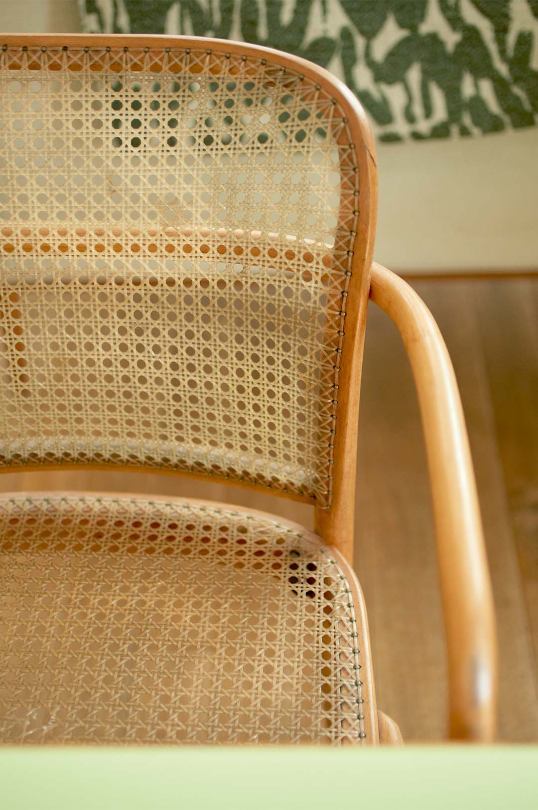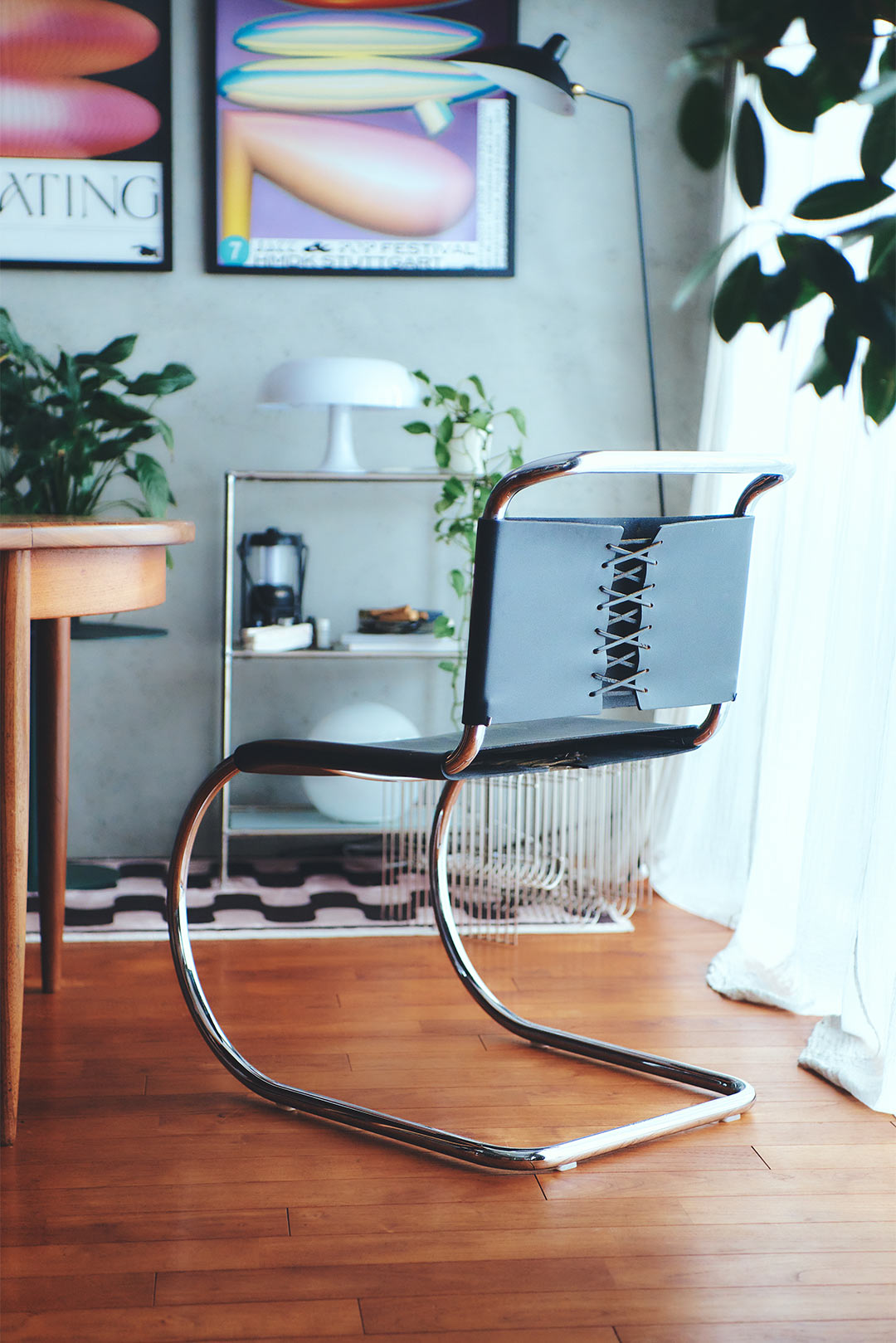 お気に入りの〈トーネット〉のチェア。「ラタンで編まれたものはよく見かけますが、これはビニール素材。半透明なのが可愛くて気に入っています。穴が空いてしまったので、今は半分観賞用です(笑)」